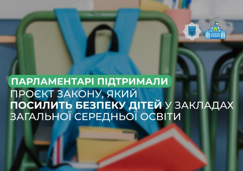 21 листопада у першому читанні депутати Верховної Ради України ухвалили законопроєкт № 11543 "Про внесення змін до ЗУ "Про повну загальну середню освіту" щодо запровадження заходів безпеки в закладах загальної середньої освіти", над створенням якого, зокрема, працювало Міністерство внутрішніх справ України спільно з Міністерством освіти і науки України.