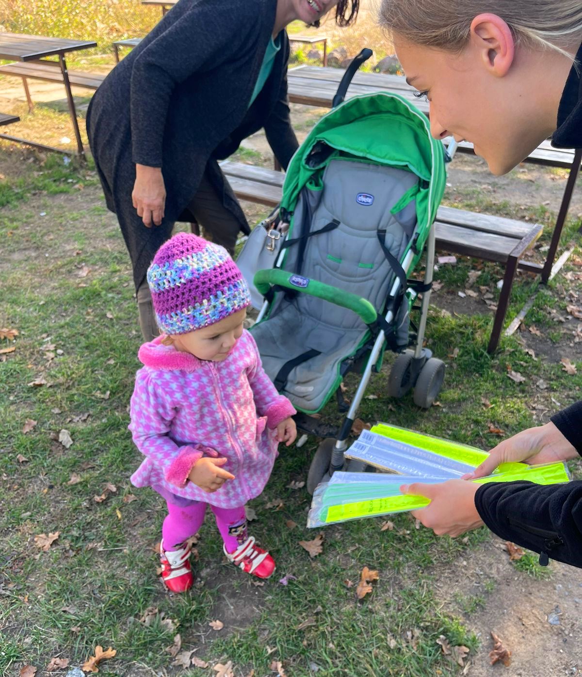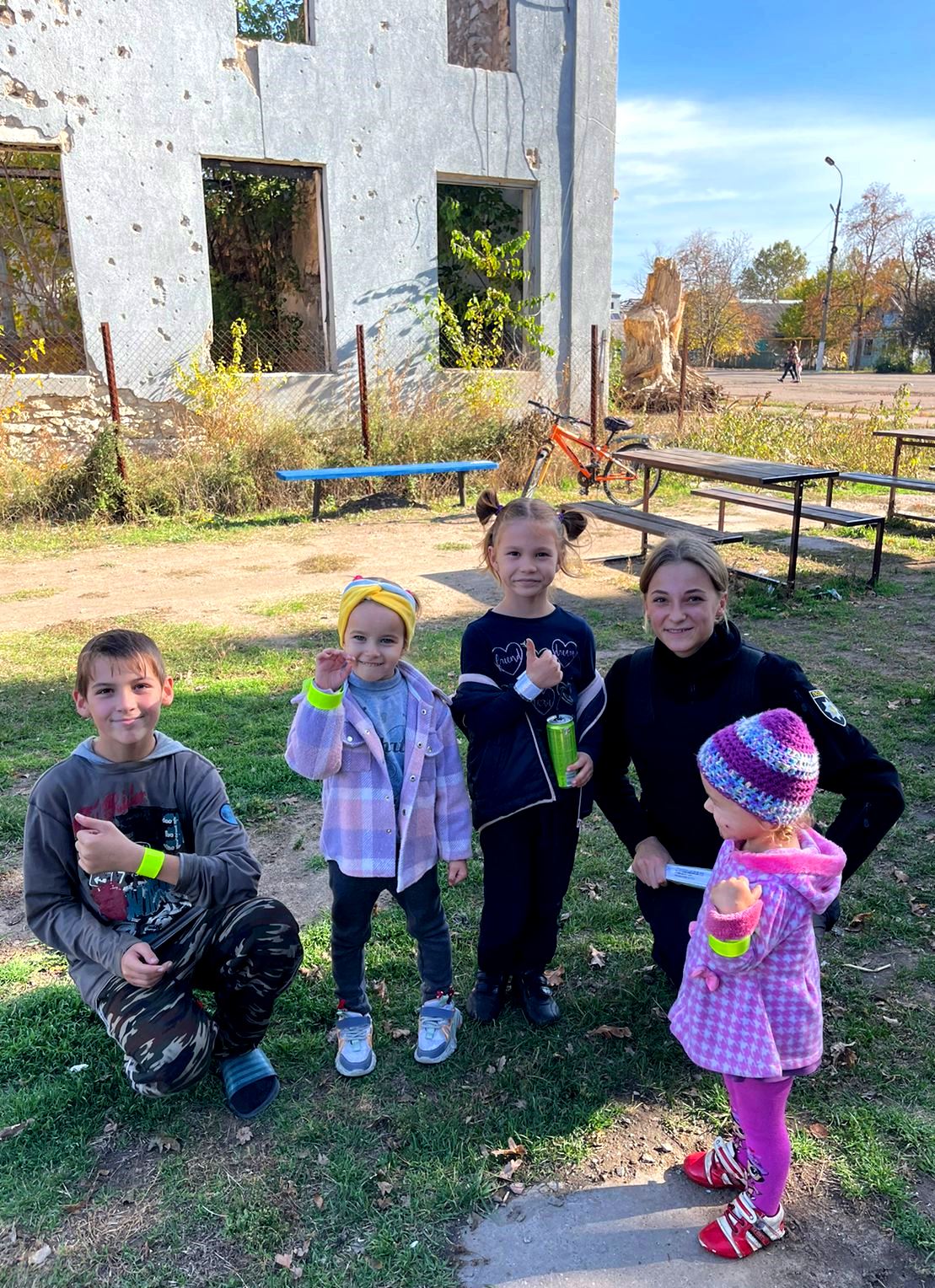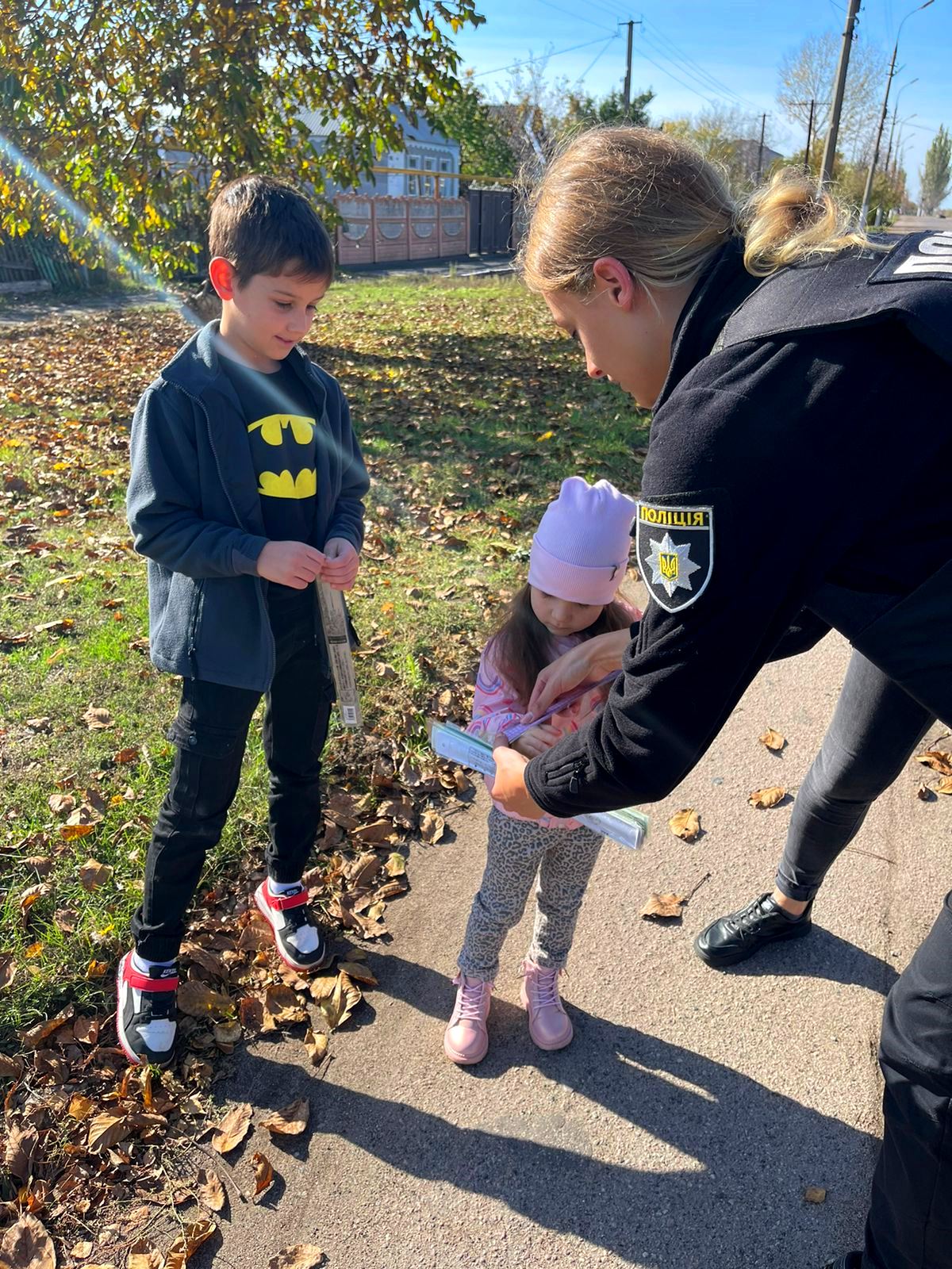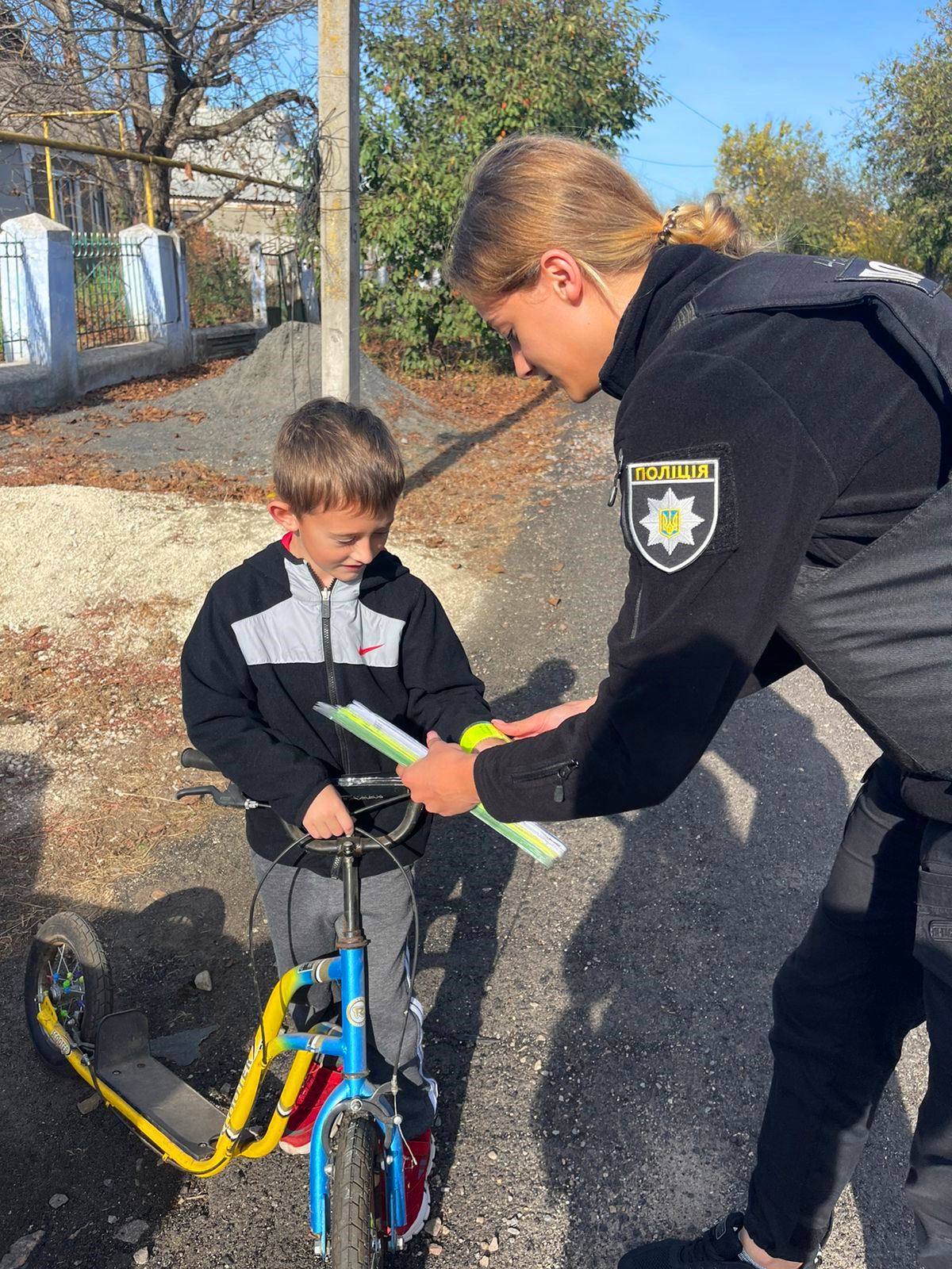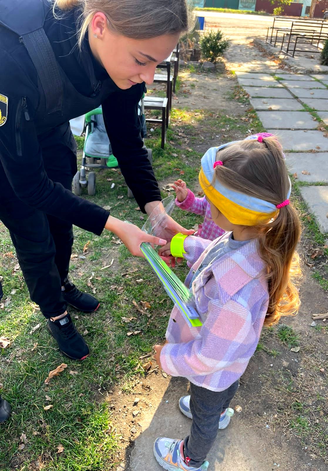 Інспектор розповіла дітям про основні дорожні знаки, їх значення та правила перетину проїжджої частини, як треба їздити на самокатах і велосипедах. Також наголосила на необхідності використання в темний час доби світловідбивальних елементів та неприпустимості використання навушників під час переходу дороги. Усім діткам поліцейська подарувала яскраві браслети-флікери.