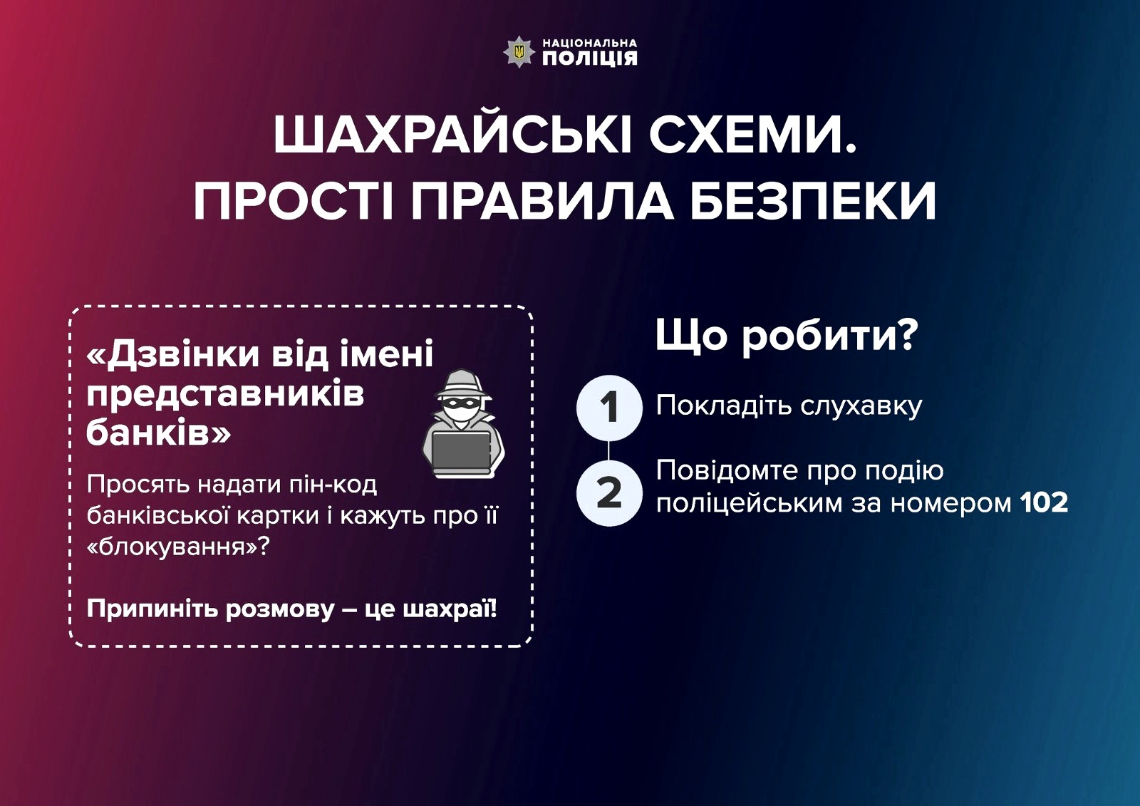 Поліція вкотре закликає громадян бути максимально обачними при спілкуванні з невідомими особами. В жодному випадку нікому не можна повідомляти свої особисті дані, номер і строк дії банківської карти, CVV-коди та іншу персональну інформацію. Працівники банку ніколи не телефонують і не вимагають інформацію по банківському рахунку чи картці.