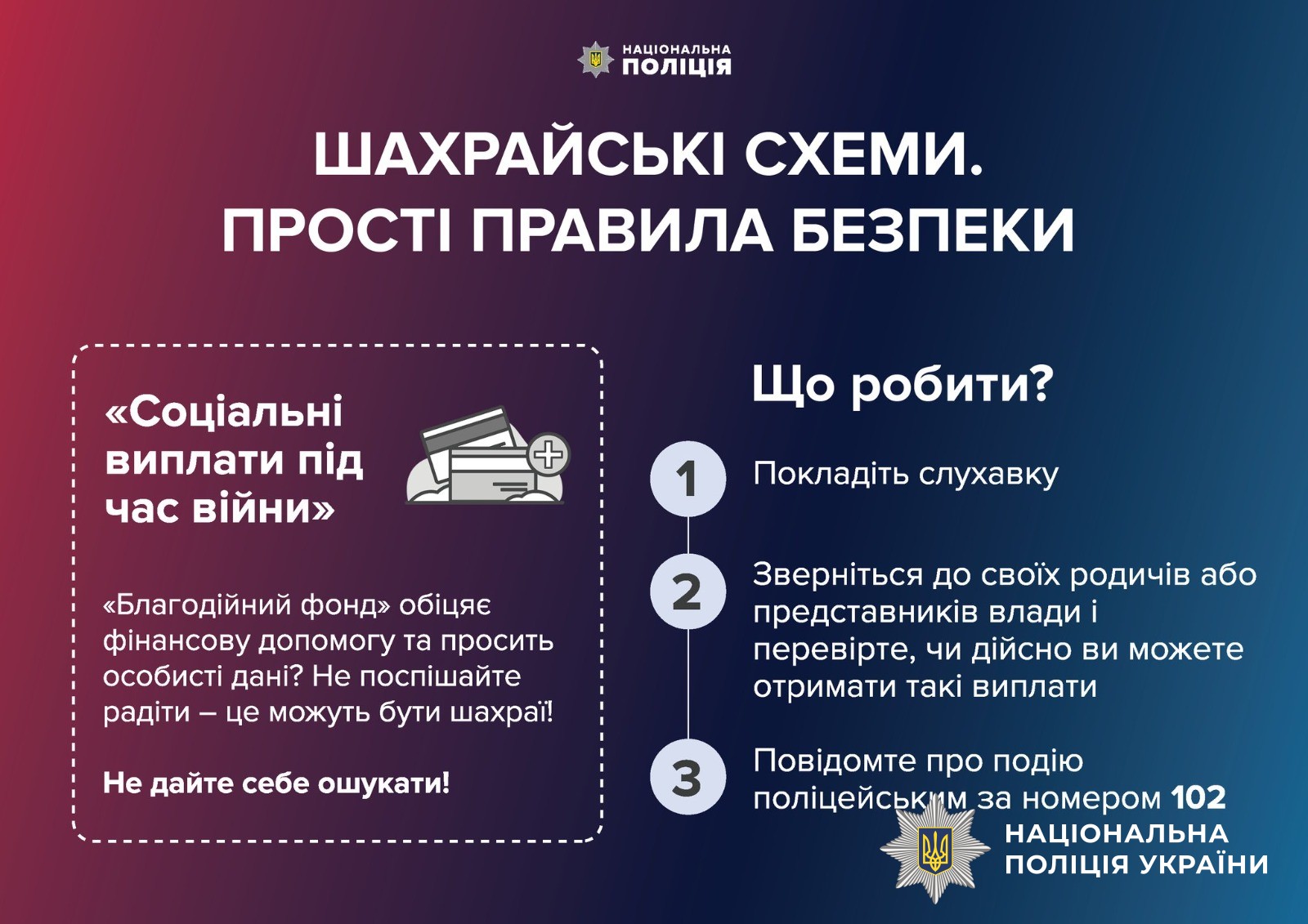 Щоб не втратити заощадження, отримуйте інформацію про грошові виплати лише з офіційних джерел, а не з месенджерів та мобільних додатків. Не переходьте за посиланнями та не вводьте реквізити платіжних карток на незнайомих чи підозрілих веб-сайтах. Адже шахраї можуть отримати доступ не лише до банківського рахунку, а й до кредитного ліміту.