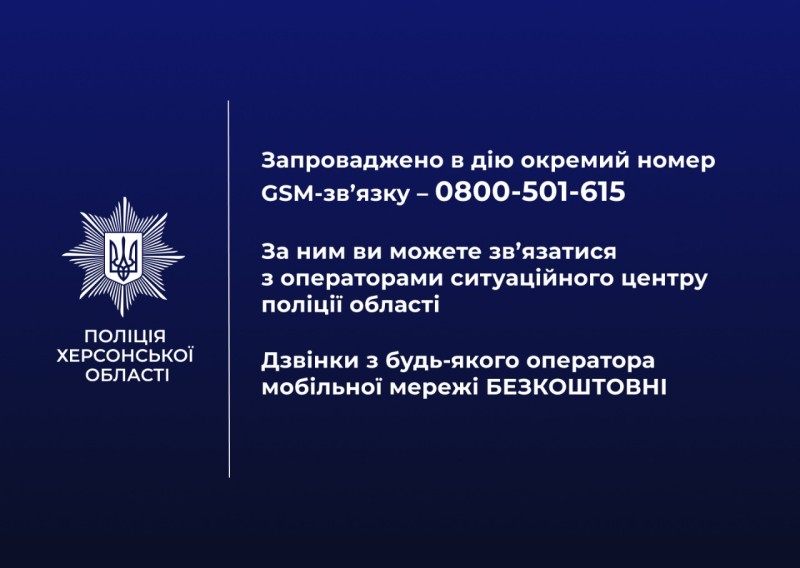 Головним управлінням поліції Херсонщини запроваджено в дію окремий номер GSM-зв’язку – 0800-501-615.