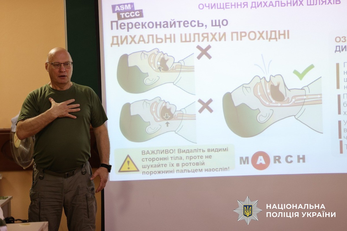 Інсруктури розповіли поліцейським про порядок оцінки стану постраждалого за протоколом M.A.R.C.H. Цей алгоритм розроблено для того, щоб допомогти швидко ідентифікувати травми, які є найбільш загрозливими для життя, стабілізувати стан потерпілого та збільшити шанси на виживання.