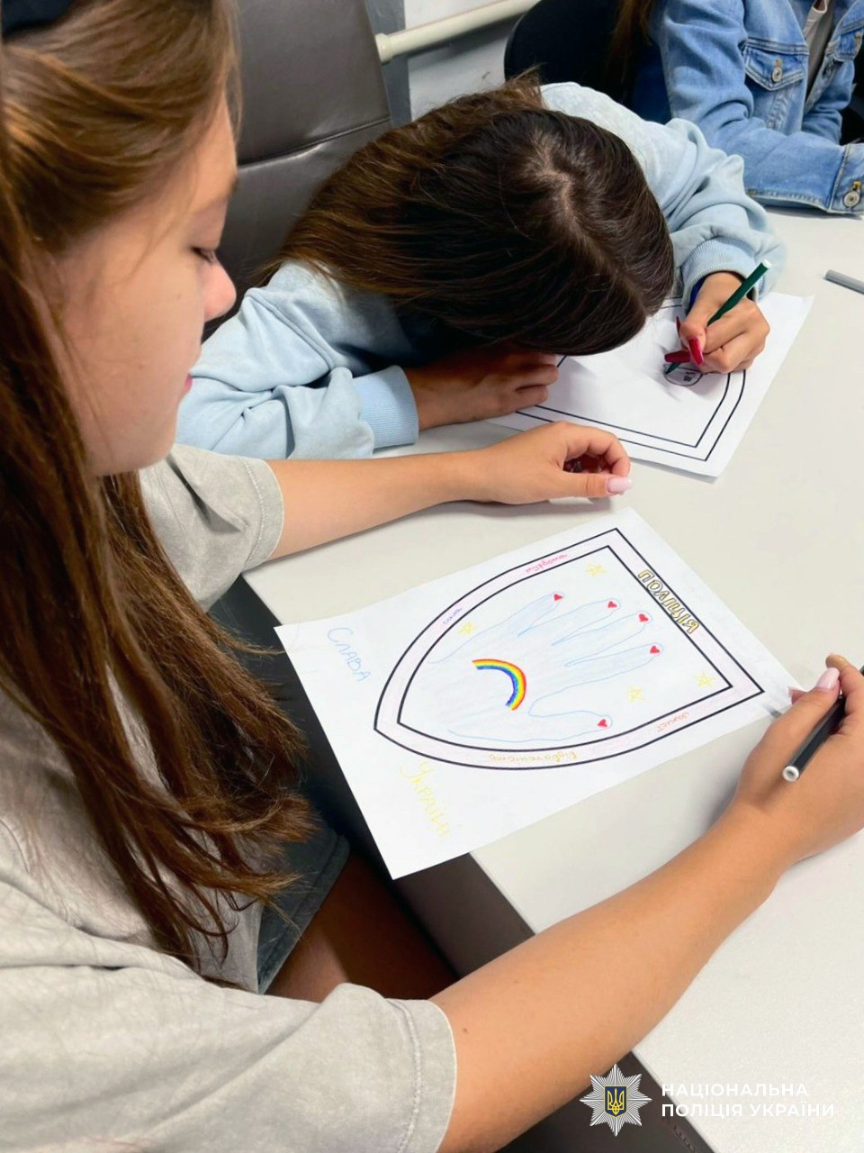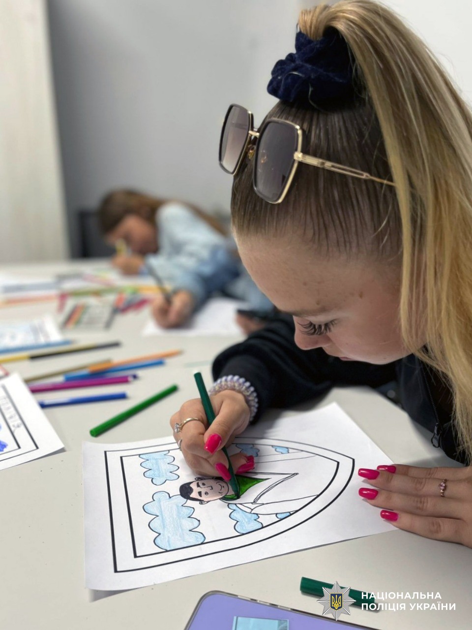 На малюнках діти зображували Герб України, символіку поліції, використовували кольори нашого Прапора. Також говорили з поліцейськими про їх службу, правила безпеки, разом мріяли про Перемогу.