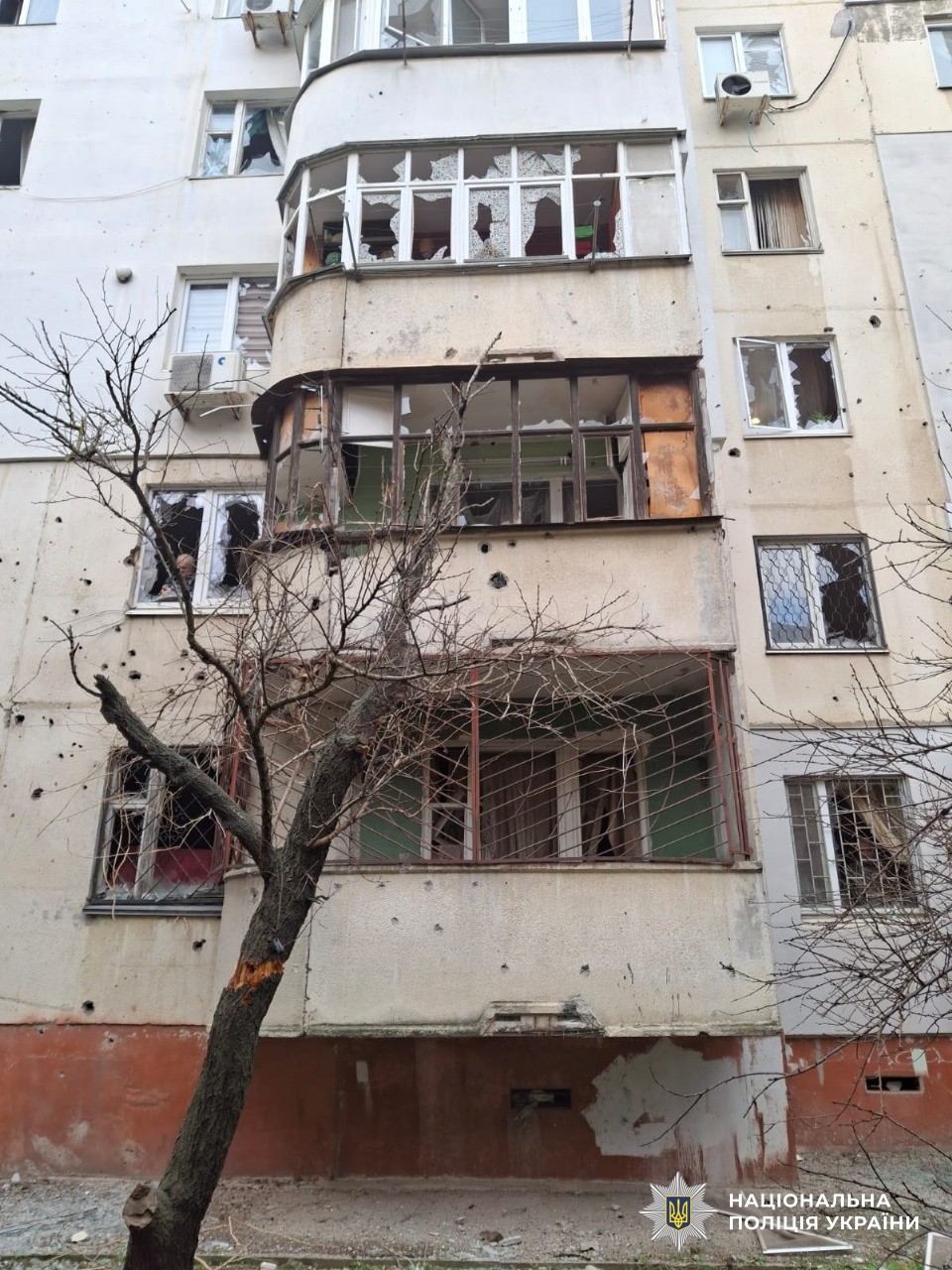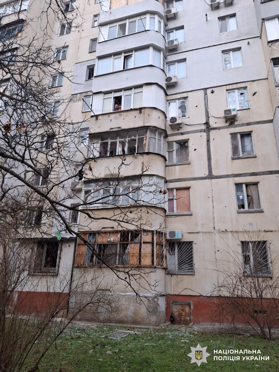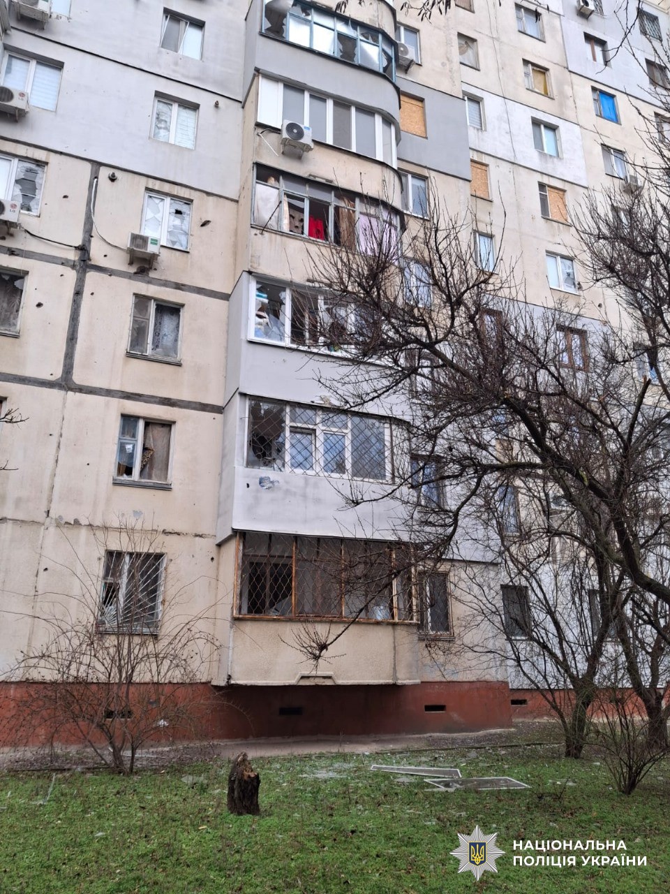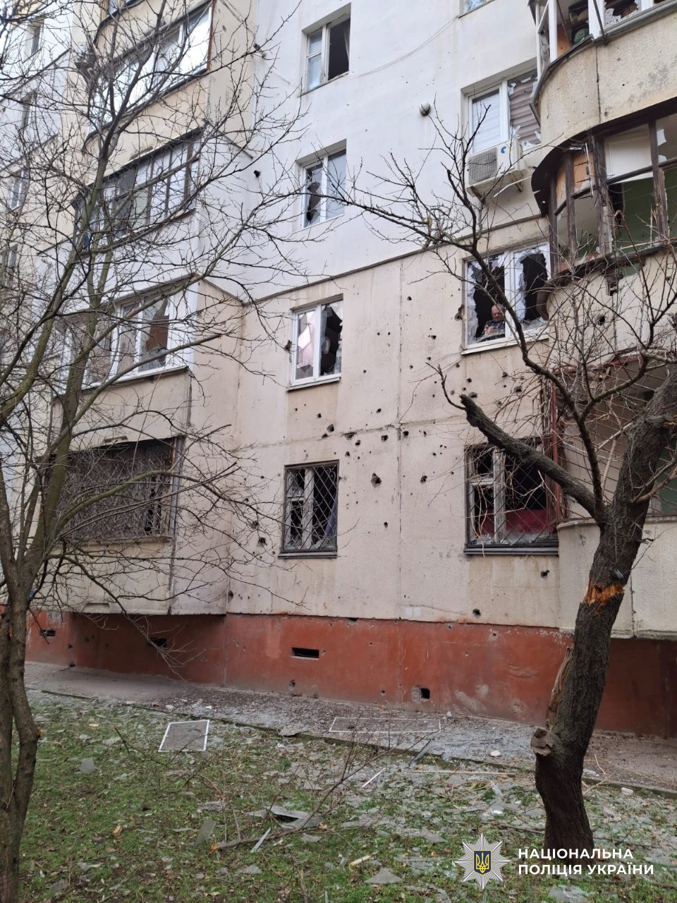 У Центральному районі міста через неодноразові скиди з безпілотників пошкоджено комунальний та два службові автомобілі поліції. Отримав поранення 59-річний чоловік, який перебував на вулиці. Постраждалого доправили до лікарні з вибуховою травмою і уламковим пораненням ноги.