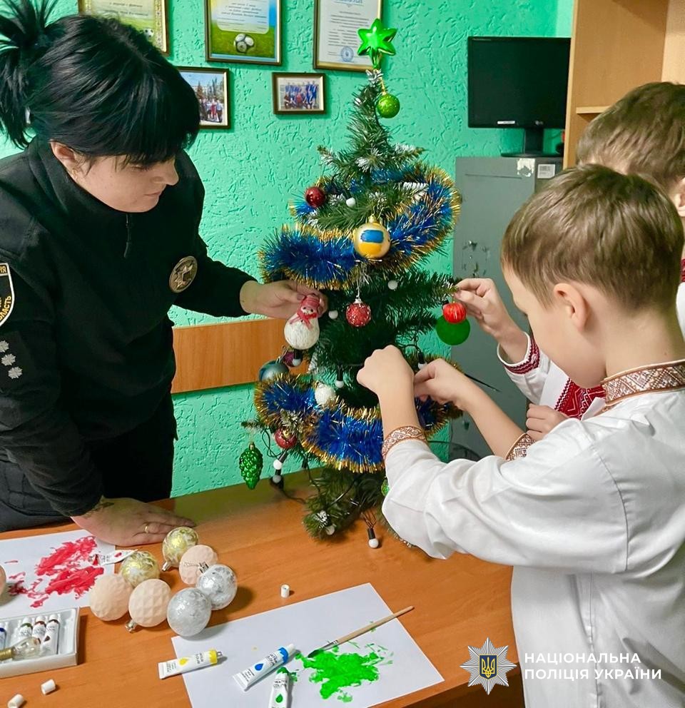 На Херсонщині діти разом із поліцейськими прикрасили ялинку власноруч виготовленими патріотичними іграшками