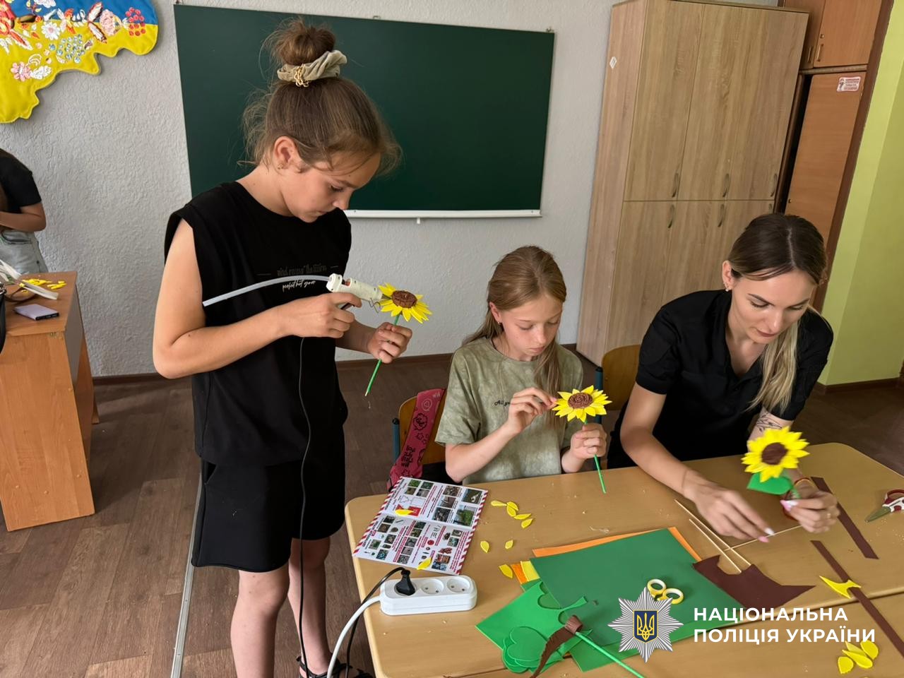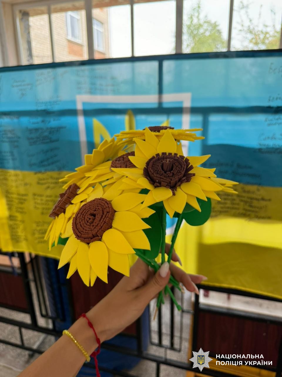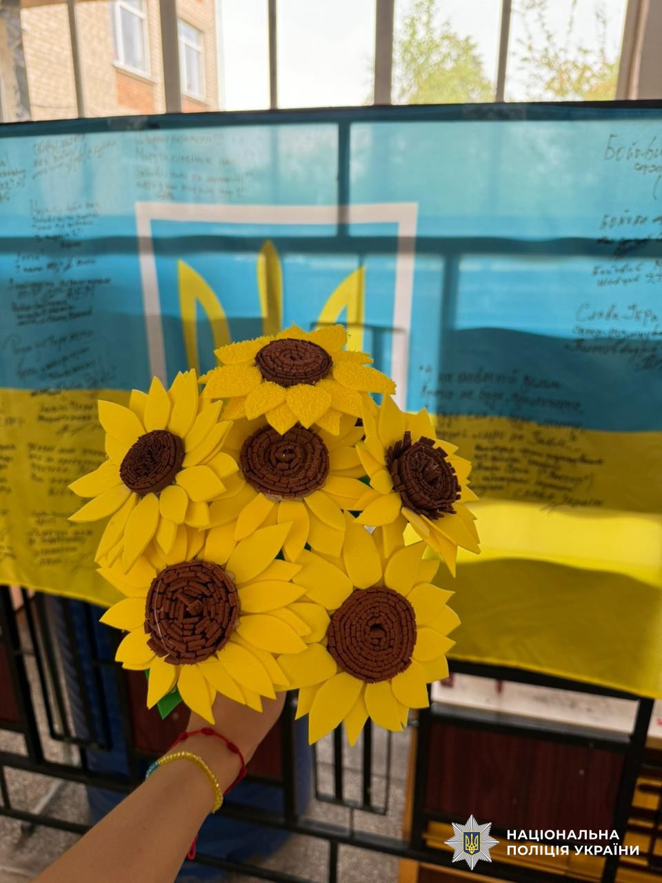 Діти разом із дорослими з різних матеріалів власноруч виготовили соняхи на честь пам’яті Героїв, які віддали життя за Україну. Працівники поліції розповіли малечі, наскільки важливо пам’ятати кожного, хто поліг за нашу свободу, завдяки кому ми можемо жити, працювати та навчатися.