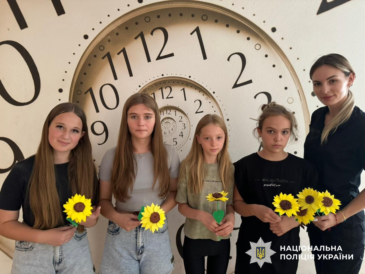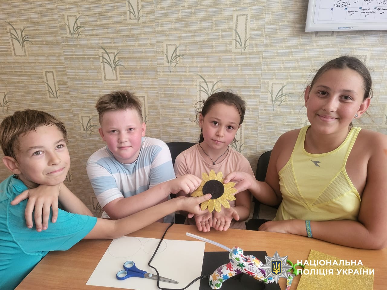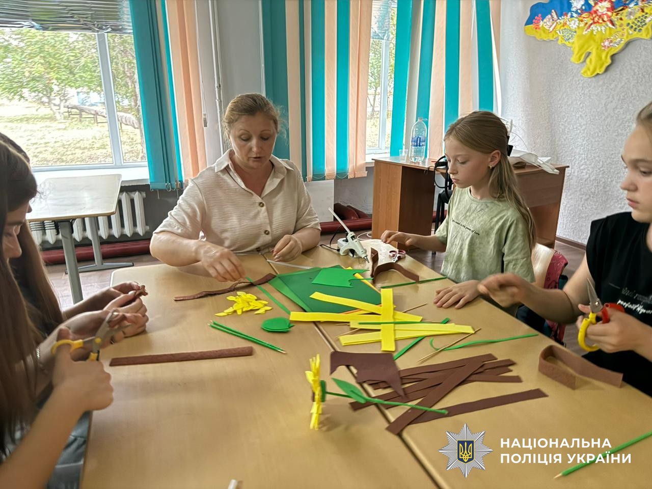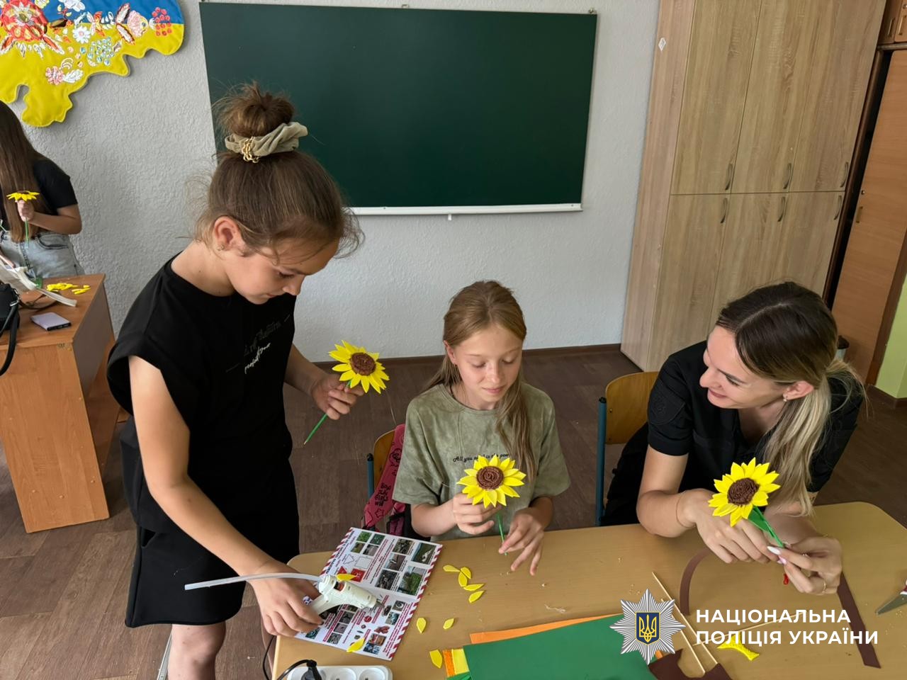 Діти разом із дорослими з різних матеріалів власноруч виготовили соняхи на честь пам’яті Героїв, які віддали життя за Україну. Працівники поліції розповіли малечі, наскільки важливо пам’ятати кожного, хто поліг за нашу свободу, завдяки кому ми можемо жити, працювати та навчатися.