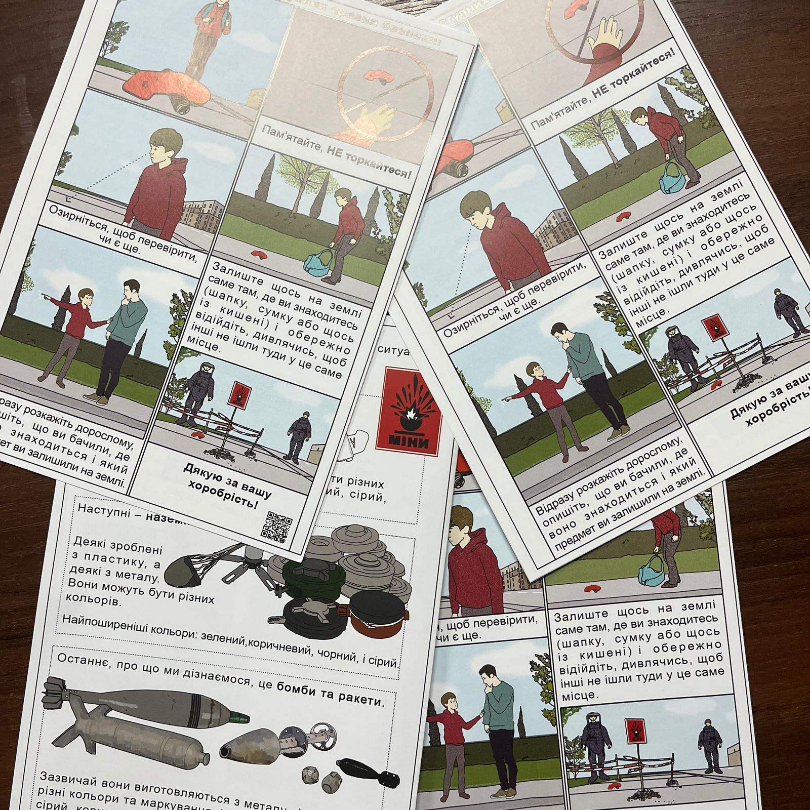 Поліцейські роздають хлопчикам та дівчаткам спеціальні листівки, де з яскравих картинок, у максимально доступній та зрозумілій формі діти дізнаються, який вигляд мають вибухонебезпечні предмети, у чому їх небезпека та що в такому разі робити. Головне – не підходити, не брати до рук й одразу повідомляти в поліцію про такі знахідки.