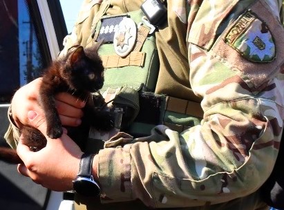 З обстрілюваної російською армією Білозерки поліцейські спільно з волонтерами та місцевою владою евакуювали жінку з трьома дітьми віком від 7 до 13 років. Малеча не могла залишити напризволяще домашнього улюбленця кошеня Мишку, тож і його взяли з собою.