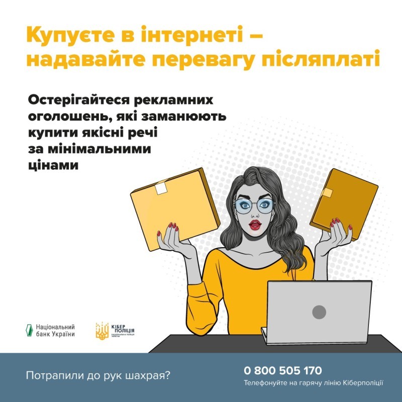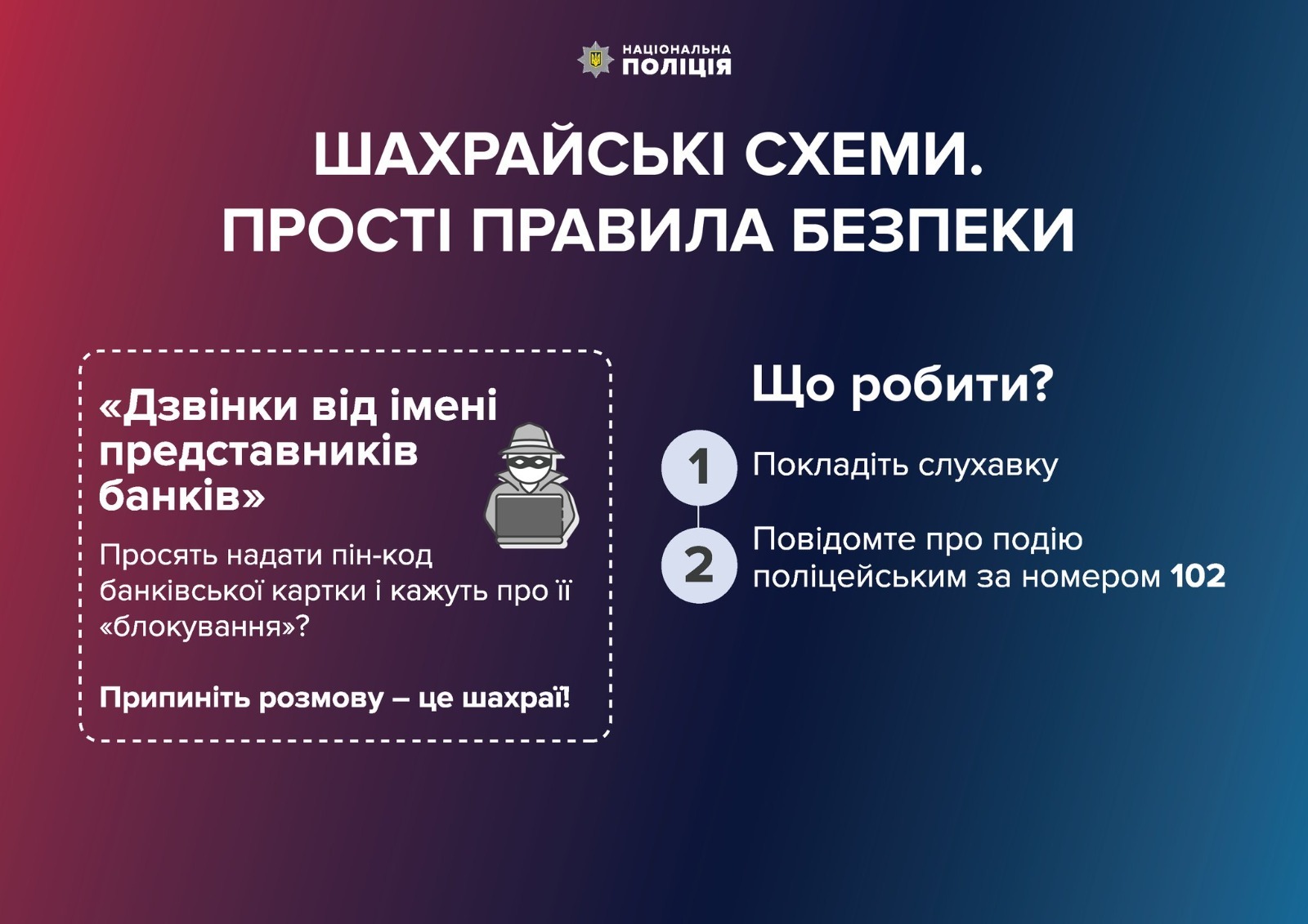 Шановні громадяни! Будьте обачними та обережними! Не розголошуйте нікому дані своїх банківських карток: пін-код, СVV-код, термін дії карти, паролі з смс-повідомлень. Купуйте товари лише на перевірених сайтах та не робіть передоплату.