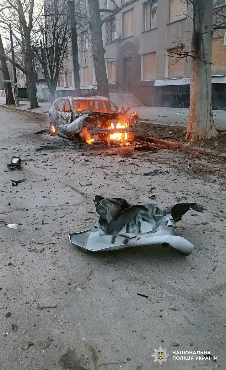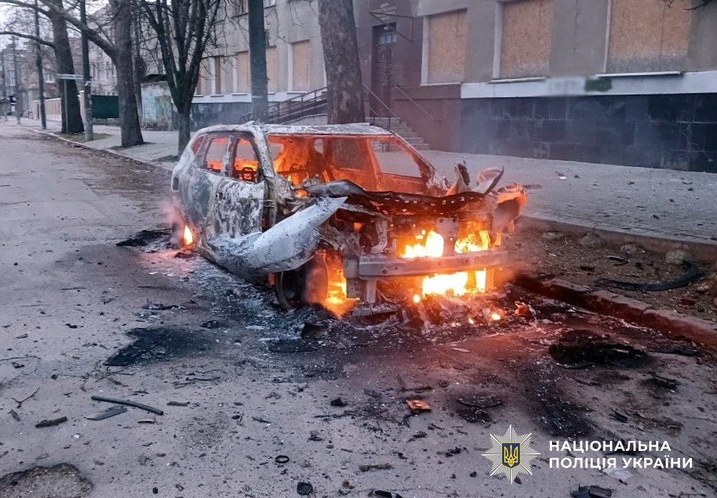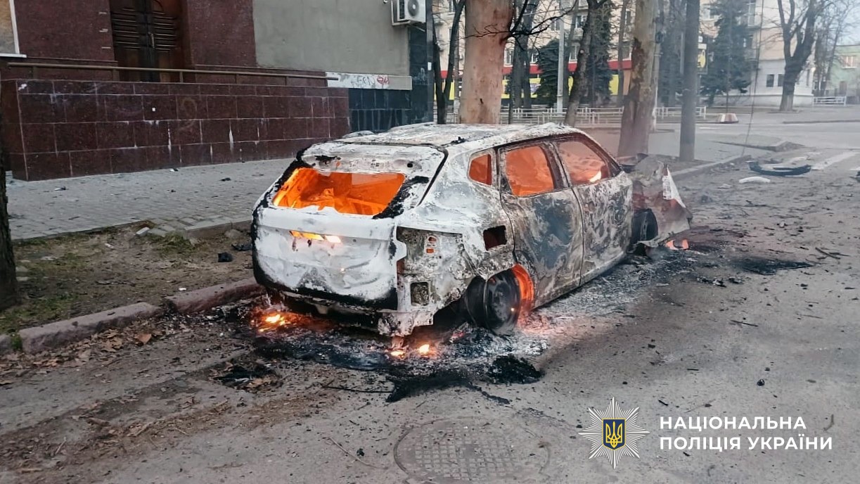 В Центральному районі російський FPV-дрон атакував службовий автомобіль поліції. Отримав поранення 48-річний поліцейський. У нього діагностували вибухову та черепно-мозкову травми, контузію й уламкове поранення голови. Транспортний засіб вигорів вщент. В результаті інших атак пошкоджено два цивільні автомобілі. Ще одну автівку пошкоджено через скид вибухівки з БпЛА.