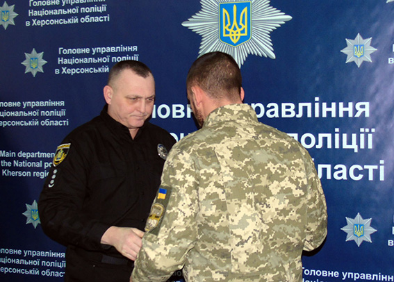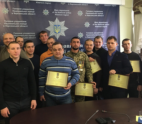Сьогодні начальник поліції Херсонщини Артур Мєріков за проявлені мужність та патріотизм під час бойових дій в зоні проведення АТО вручив 19 колишнім бійцям батальйону «Херсон» відзнаки Президента України «За участь в антитерористичній операції».