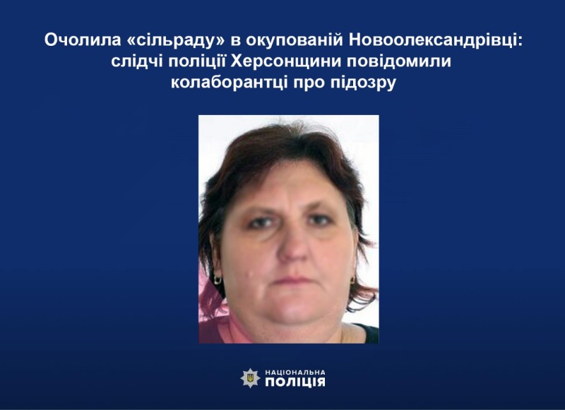 Працівники карного розшуку відділення поліції №1 (Високопільське) Бериславського районного відділу поліції встановили, що 46-річна мешканка Нововоронцовки з власної ініціативи погодилася співпрацювати з окупаційною владою. В квітні 2022 року зловмисниця обійняла посаду так званого «глави новоалєксандровского сєльского совєта бєріславского района хєрсонской області».
