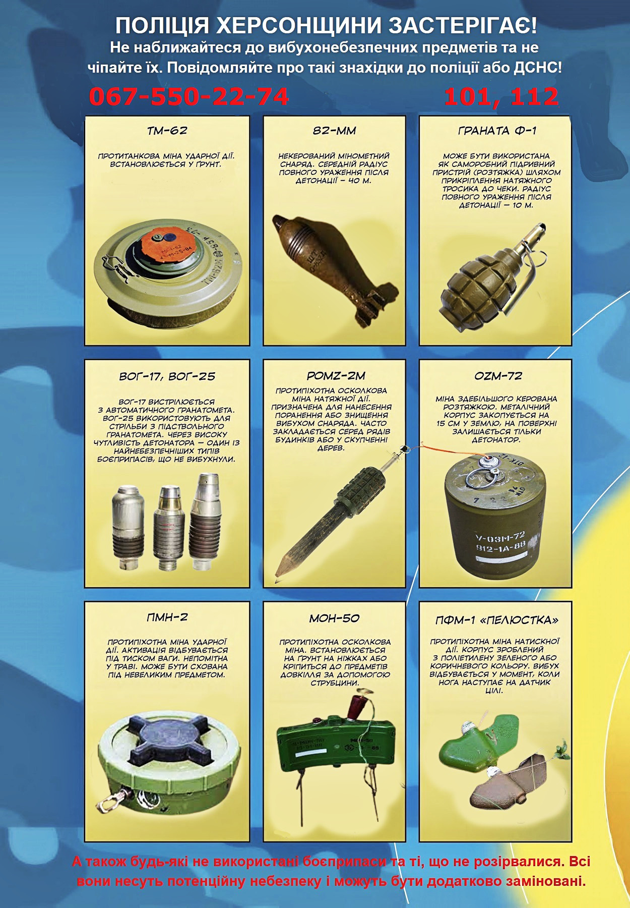 На світлині уважно ознайомтеся із зовнішнім виглядом та технічними характеристиками вибухонебезпечних предметів. У разі виявлення подібних звертайтеся за телефоном чергової частини поліції Херсонської області 067-550-22-74 або телефонуйте на «101» та на єдиний номер телефону «112» для надання екстреної допомоги. Також поліція просить небайдужих громадян повідомляти наявну інформацію про осіб, які незаконно зберігають зброю, боєприпаси та вибухові речовини. Анонімність гарантується.
