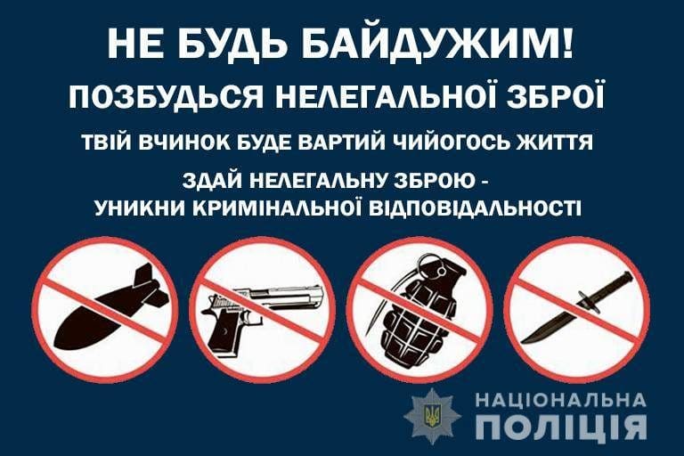 Поліція інформує, що згідно зі ст.263 Кримінального кодексу України носіння, зберігання, придбання, передача чи збут вогнепальної зброї, бойових припасів чи вибухових речовин без передбаченого законом дозволу карається позбавленням волі на строк від 3 до 7 років.