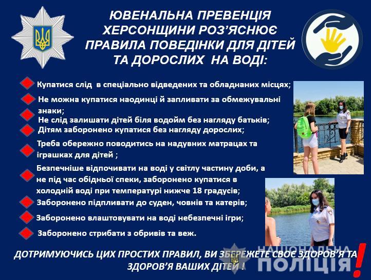 Аби запобігти нещасним випадкам на воді, працівники Управління превентивної діяльності ГУНП розробили спеціальні пам’ятки з переліком найважливіших правил поводження на водоймах. Такі листівки ювенальні поліцейські, дільничні офіцери поліції та працівники секторів реагування патрульної поліції роздають батькам та дітям на пляжах та дитячих майданчиках.