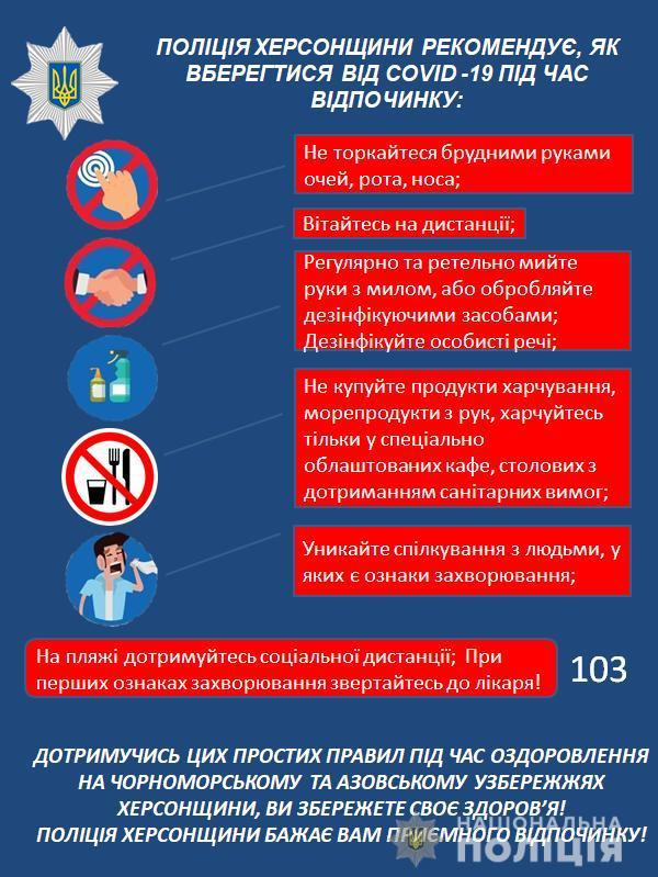 А з відкриттям курортного сезону профілактичну роботу з відпочивальниками поліцейські проводять на морському узбережжі. Працівники поліції закликають дорослих пильнувати за малечею та не залишати дітей у воді без нагляду. Також правоохоронці ознайомлюють громадян та роздають листівки щодо того, як вберегтися від COVID-19 під час відпочинку.