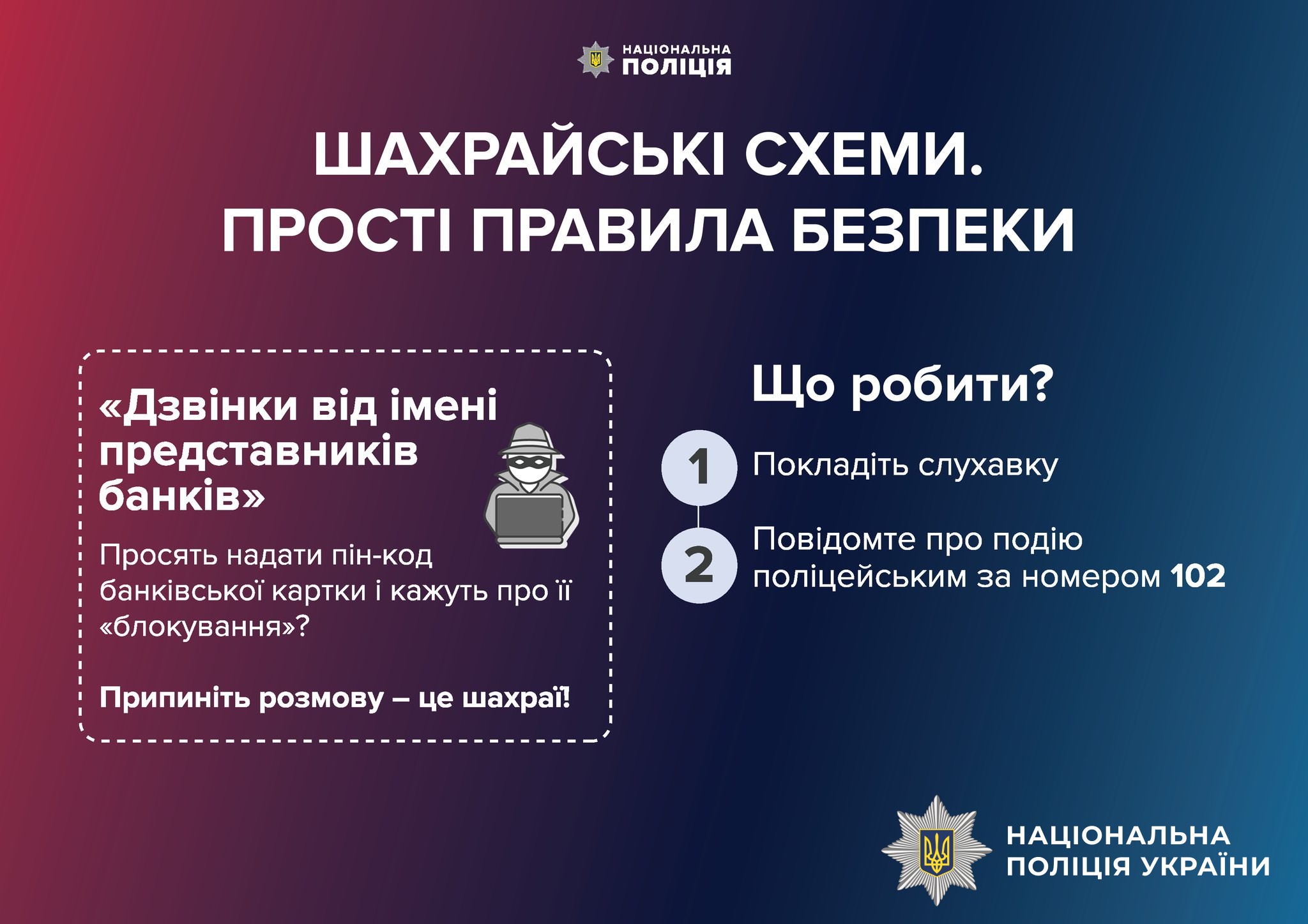 Шановні громадяни! Якщо вам телефонують нібито працівники банку, вимагають CVV-код вашої картки, інші персональні дані або просять продиктувати коди з СМС-повідомлень, рекомендуємо негайно припинити розмову та самим передзвонити в банк за номером, вказаним на зворотному боці банківської картки, або особисто відвідати відділення установи. В жодному разі не повідомляйте нікому персональні дані вашої картки.