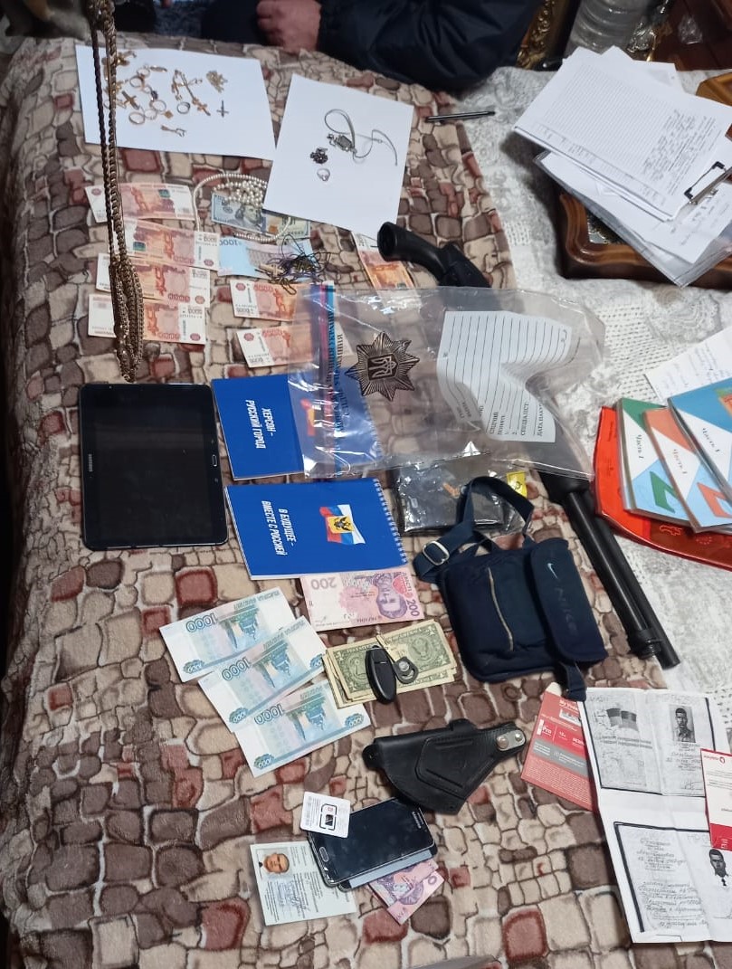 Поліцейські провели обшук за місцем проживання фігуранта, вилучили 38 тясяч російських рублів, 110 доларів США, 1000 гривень, документи, комп’ютерну техніку та записники з написом «Херсон русский город», «В будущее вместе с россией».