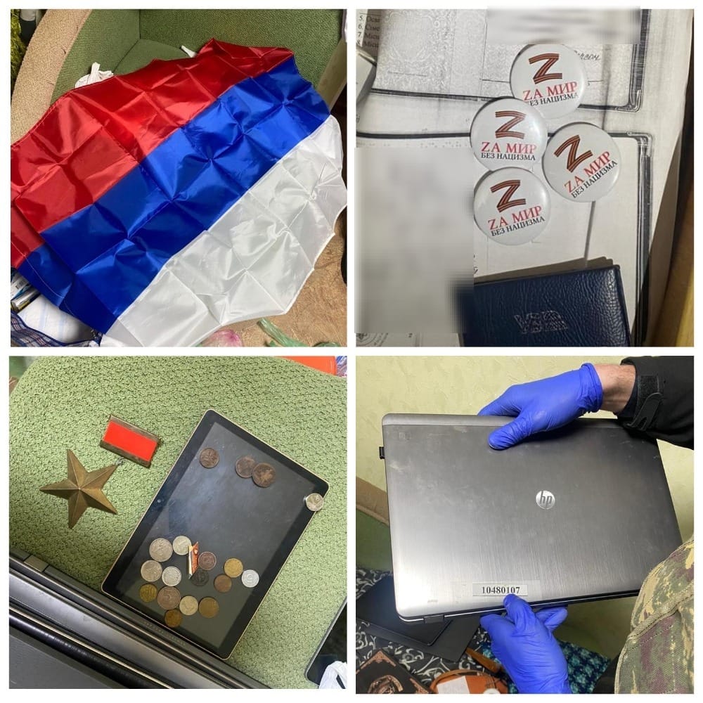 Поліцейські провели обшук за місцем проживання фігуранта, вилучили монети, нагрудний знак та нагрудну зірку рф, «Z»-символіку, документи, комп’ютерну техніку та прапор рф.