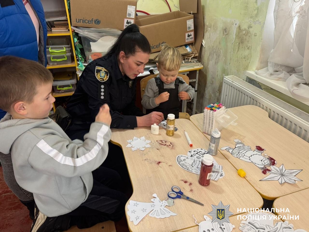 Малеча із захопленням власноруч виготовляла ялинкові прикраси та декор для вікон із зимовими й різдвяними мотивами. Кожна сніжинка, іграшка, різдвяна зірочка чи янгол були наповнені дитячими мріями, щирими емоціями та вірою у добро. Разом із поліцейськими діти прикрашали простір, наповнюючи його світлом, сміхом і святковим настроєм.