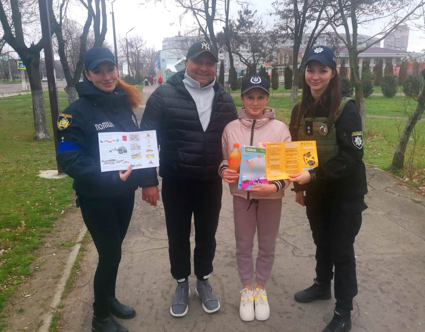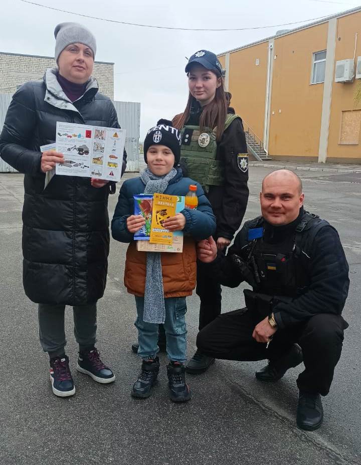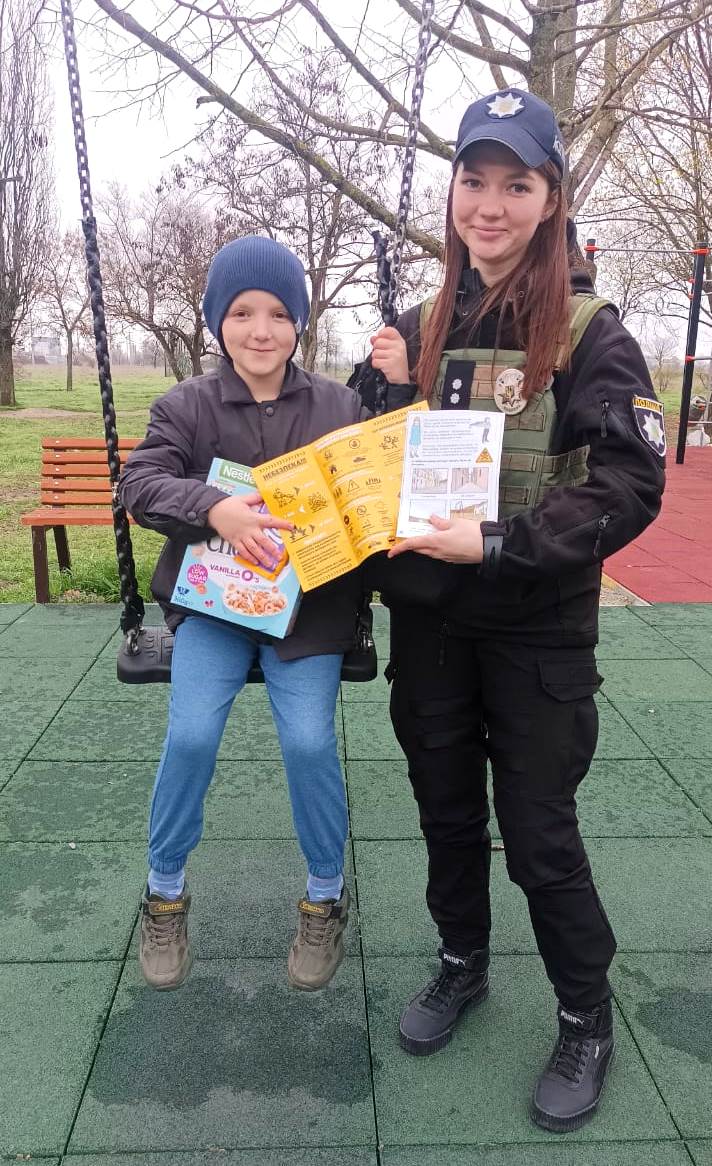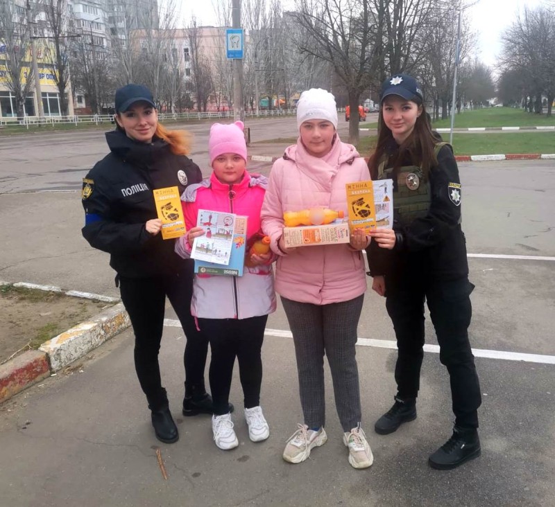 Таку інформаційну роботу ювенальні поліцейські провели в Херсоні. Біля торгівельних центрів та на дитячих майданчиках правоохоронці радили маленьким херсонцям уважно дивитися під ноги, звертати увагу на попереджувальні знаки, що вказують на наявність мін, в жодному разі не ходити до зруйнованих та обстріляних снарядами будинків, не підіймати покинуті предмети з землі, не наближатися до підозрілих предметів, боєприпасів, їхніх уламків та військової техніки. При виявленні небезпеки одразу телефонувати на номери (101) або (102).