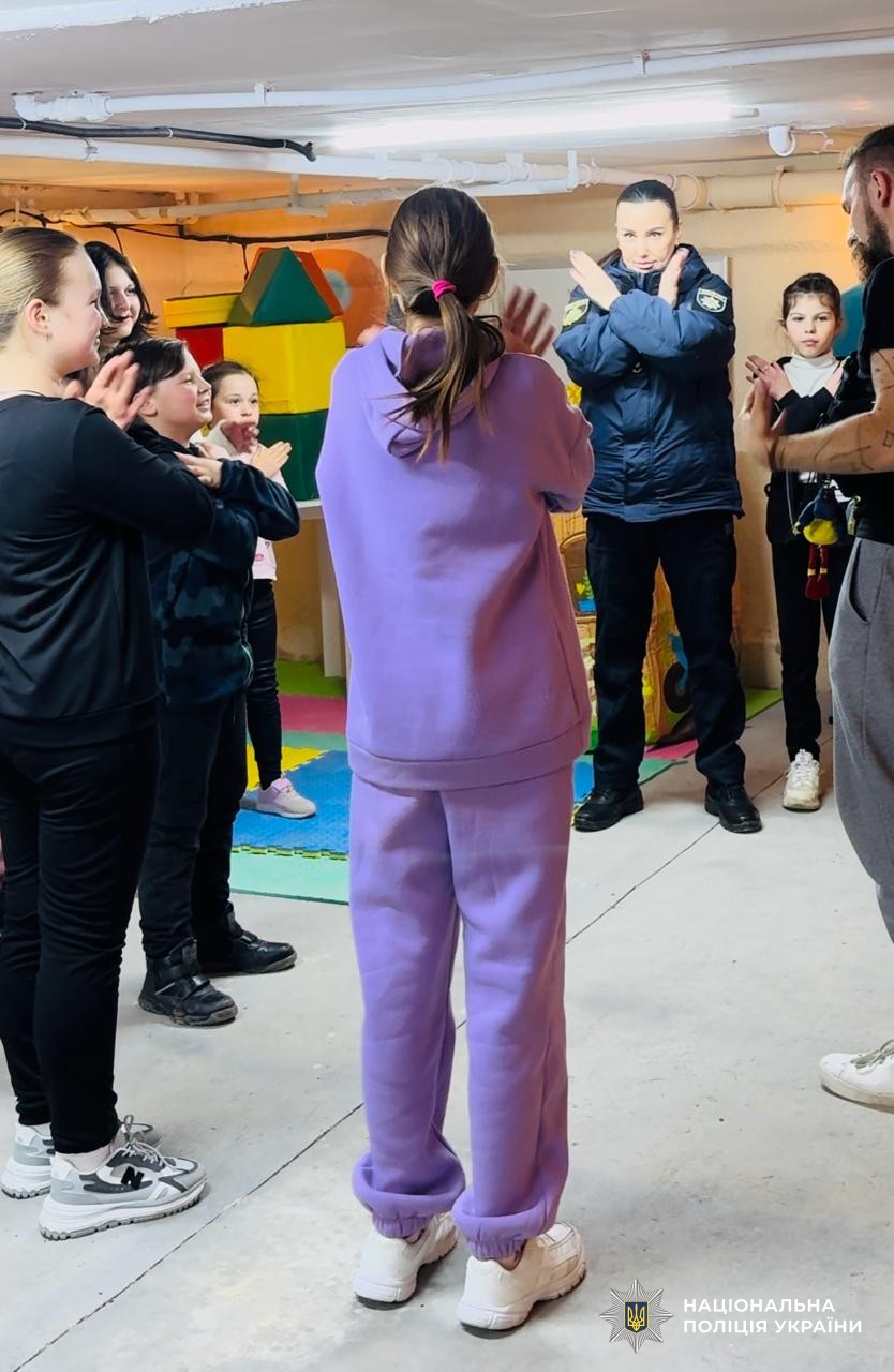 У формі гри діти повторювали за поліцейськими різні психогімнастичні вправи, що допомагають розслабитися, зняти тривожність та емоційне напруження, відновити почуття безпеки та психоемоційного комфорту. Засвоїли дихальні техніки для зняття стресу, панічних атак та м’язового напруження.