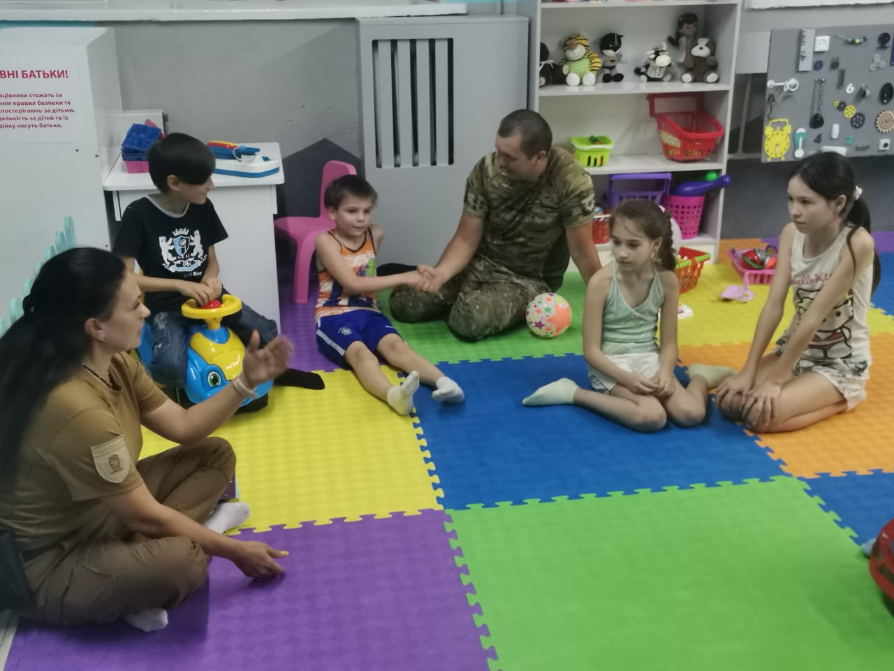 У кімнаті перебували і батьки дітей, тож дорослим поліцейські розповіли, як заспокоїти дитину під час обстрілу, показали кілька простих вправ для самозаспокоєння.