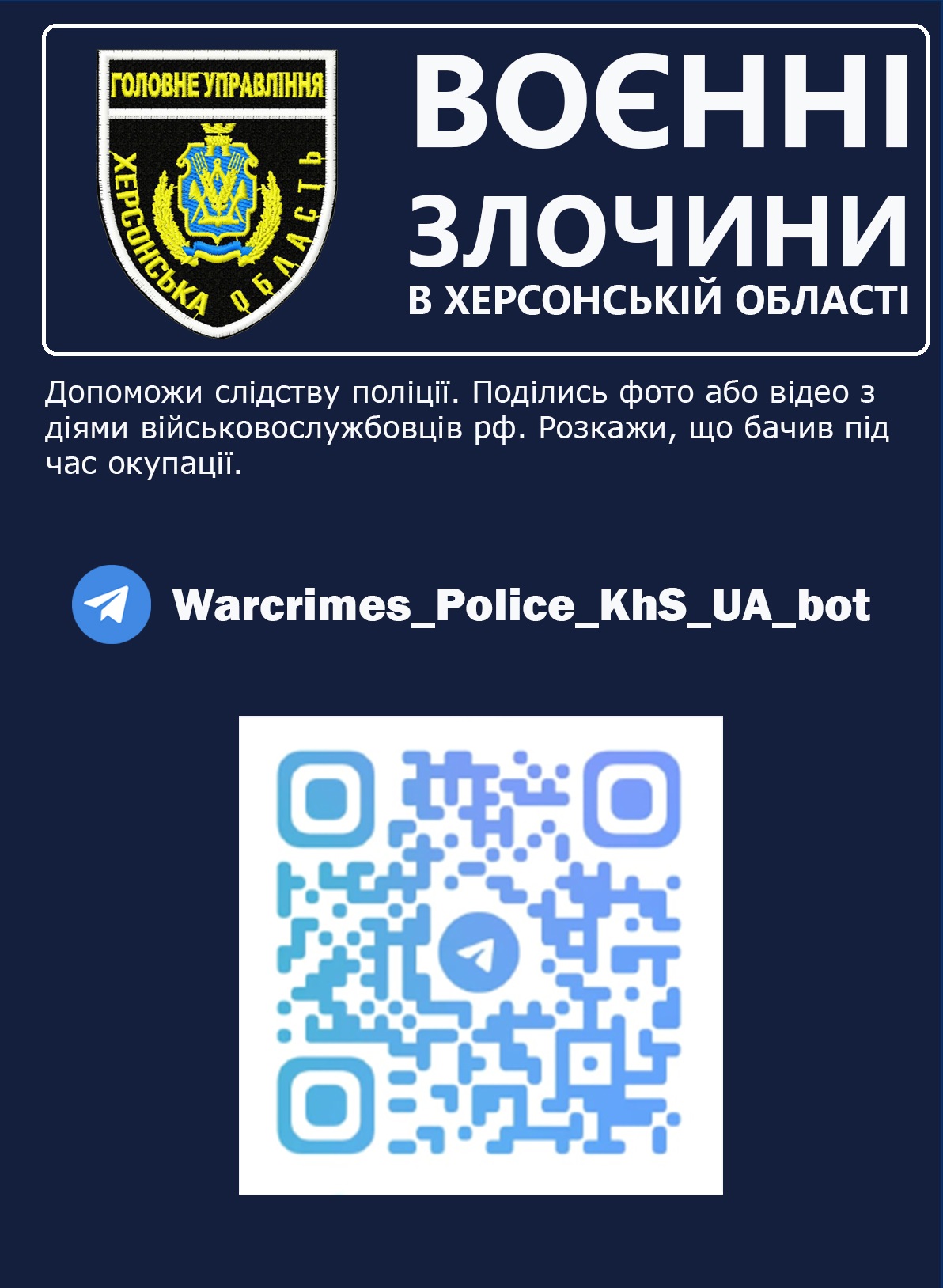 Херсонці та жителі області! Слідче управління Головного управління Національної поліції Херсонщини веде розслідування злочинів армії рф. І для цього нам потрібна ваша допомога. А саме - будь-які фото- або відеосвідоцтва дій військовослужбовців рф під час окупації територій Херсонської області. Це можуть бути фотографії чи відеозаписи, зроблені за допомогою смартфонів, камер спостереження, відеореєстраторів чи інших приладів.