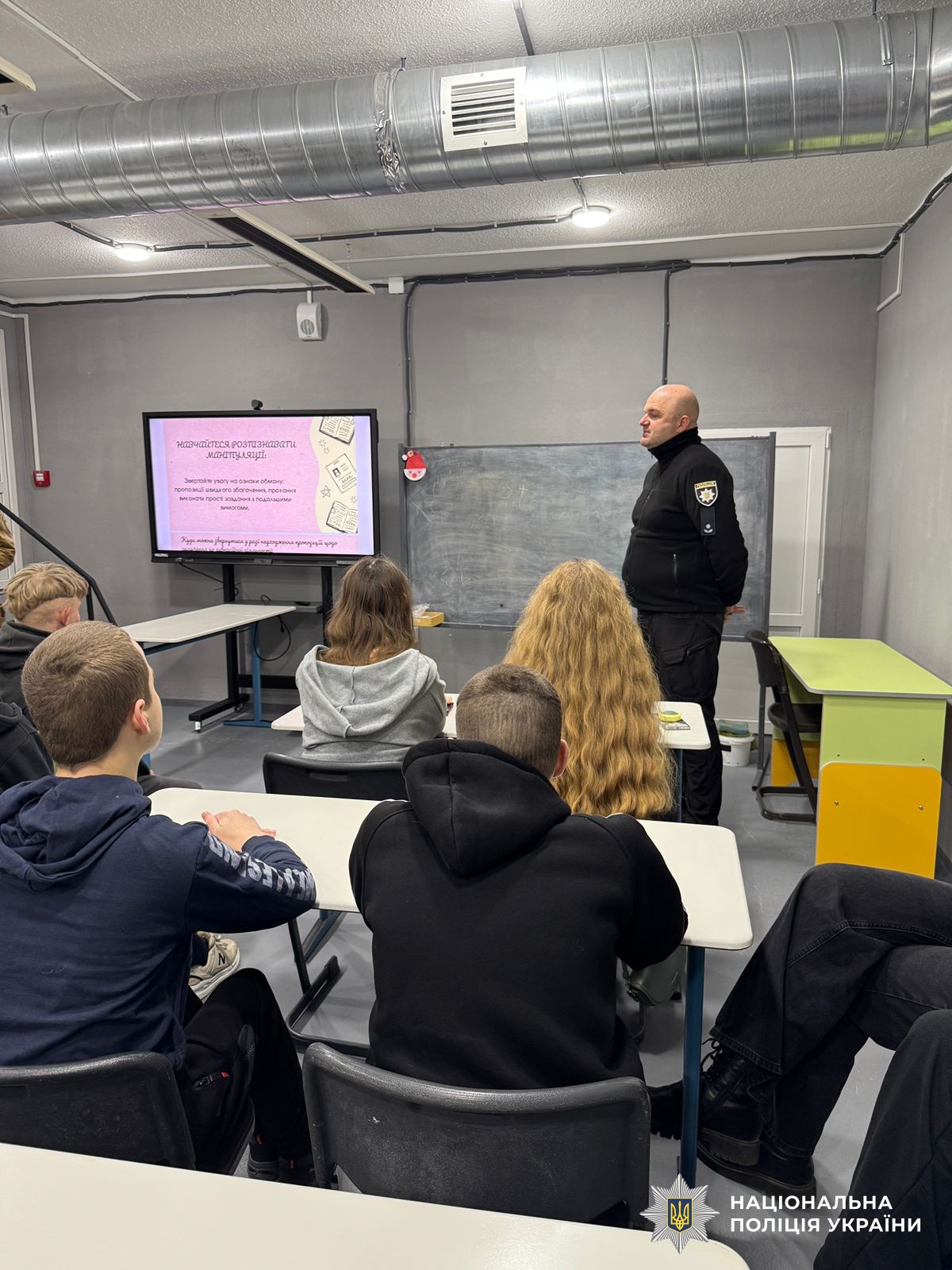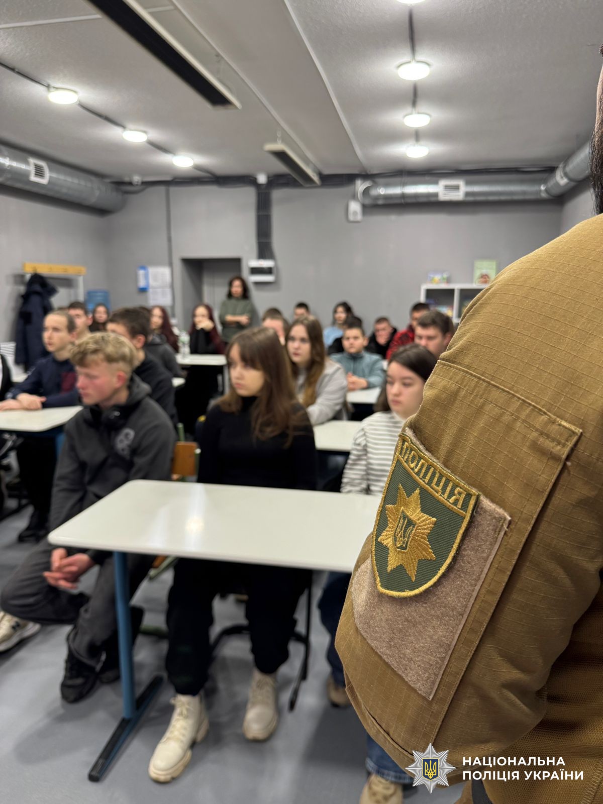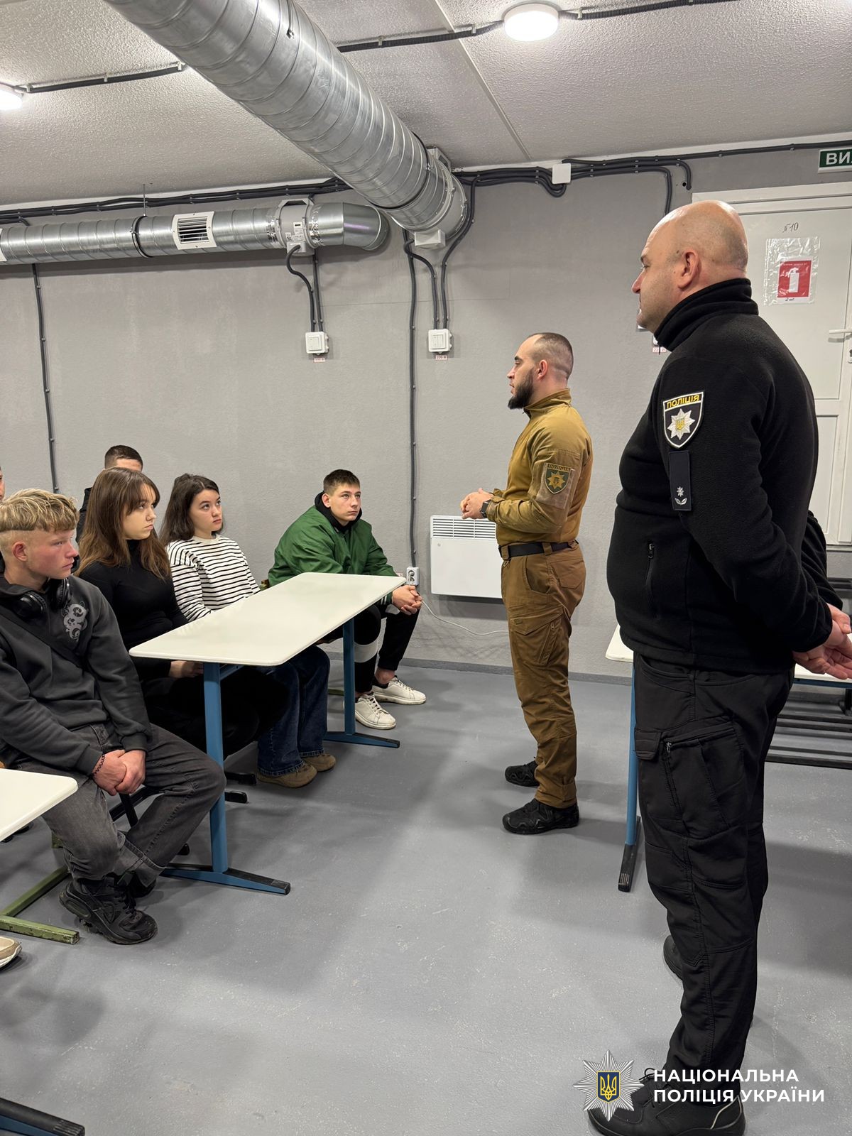 Сьогодні працівники відділу ювенальної превенції обласного главку поліції спільно з ювенальними поліцейськими Херсонського районного управління провели для юних жителів Музиківської громади пізнавально-патріотичну годину «Від заходу й до cходу: єдність українського народу». З урахуванням безпекової ситуації в області захід проводився в укритті.