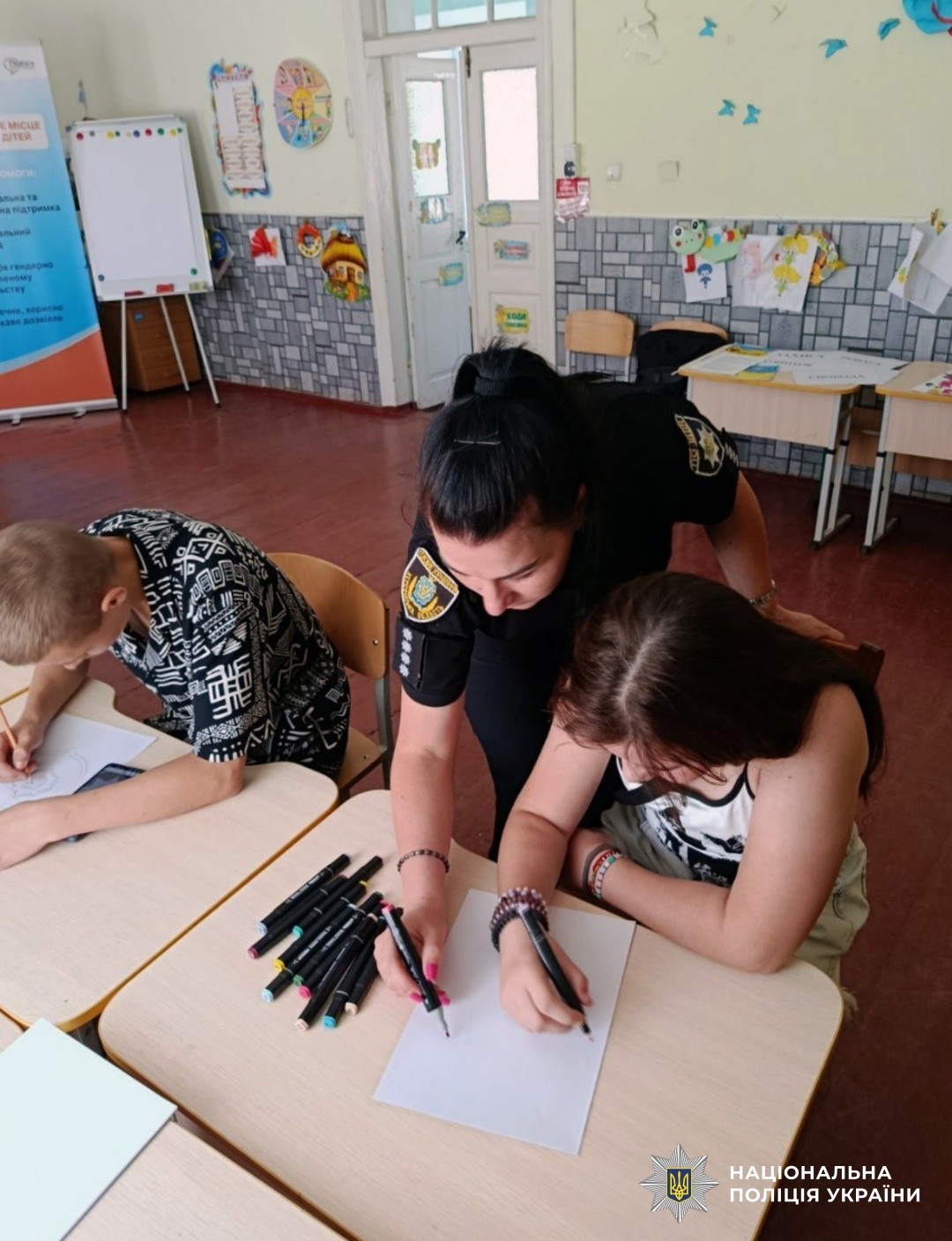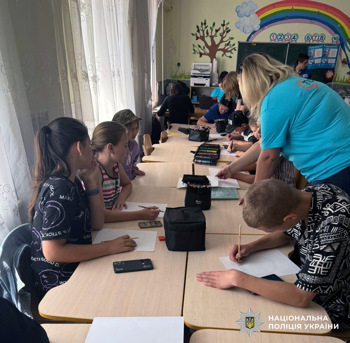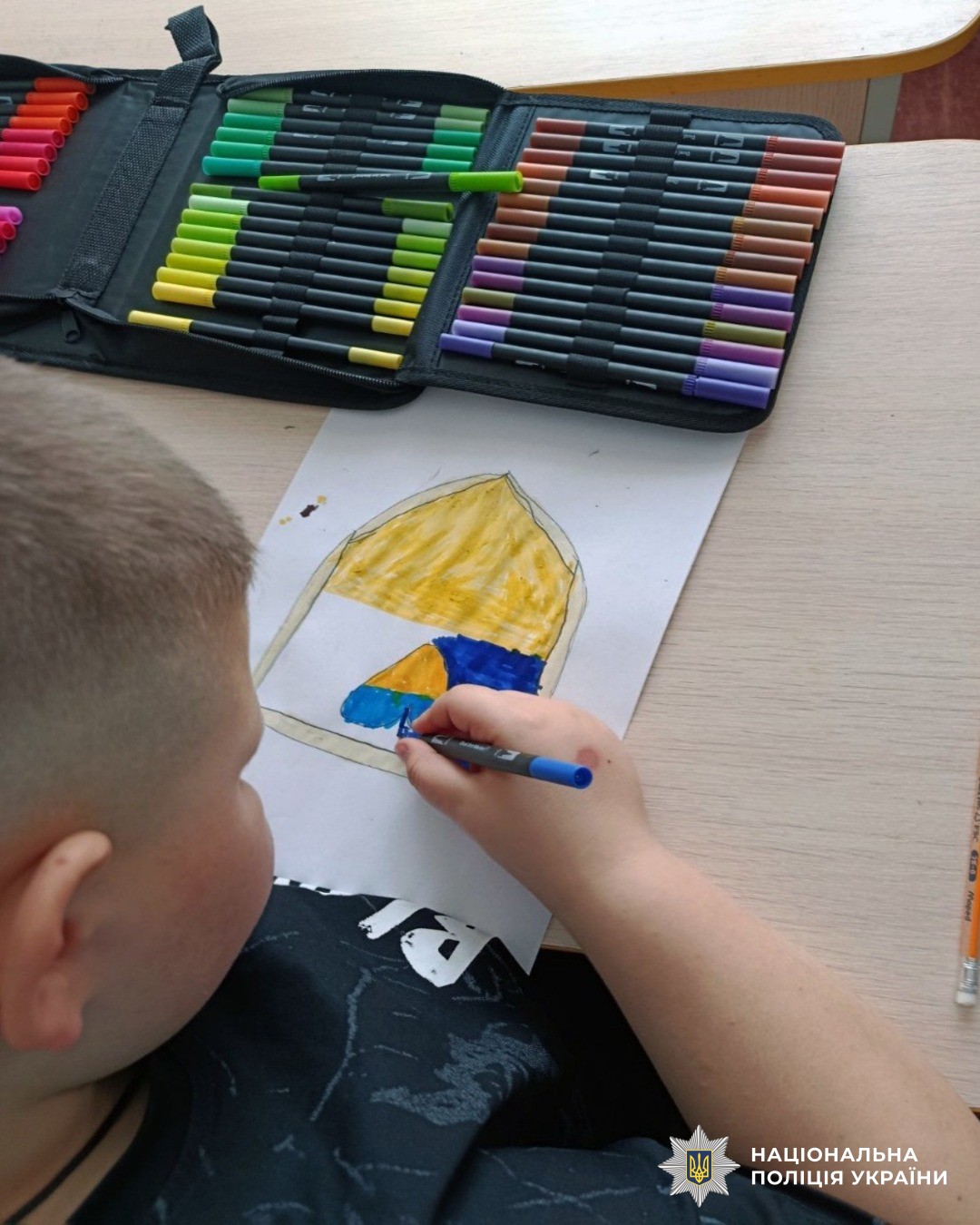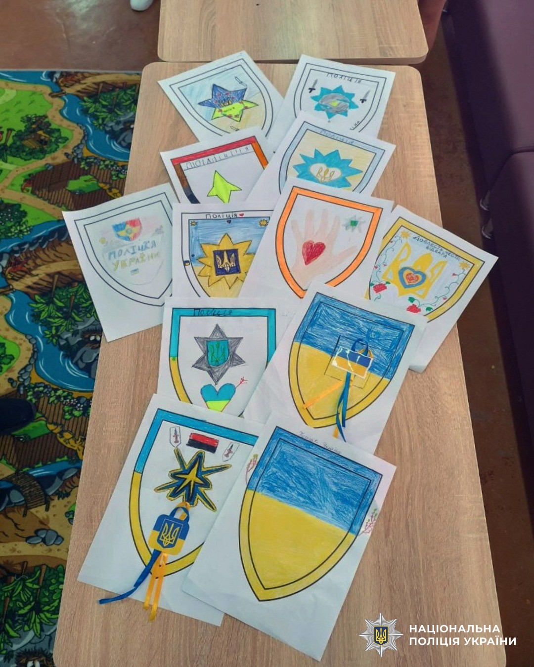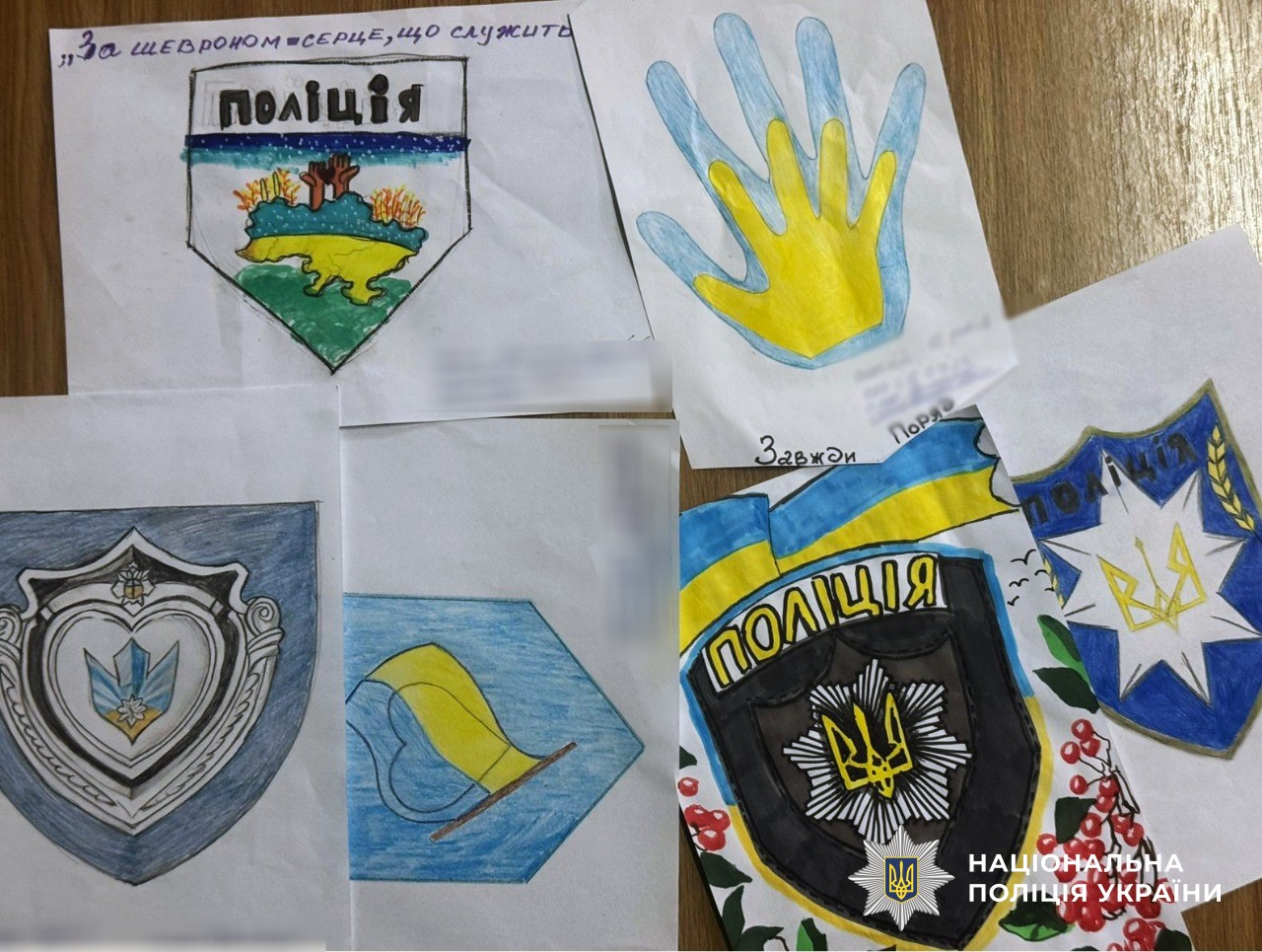 Долучилися місцеві діти й до конкурсу «Малюю шеврон», що його нещодавно оголосила Ювенальна Поліція України. Юним українцям пропонують створити власну версію поліцейського шеврона — символа, який уособлює захист, безпеку та турботу про кожну дитину. Тож усі разом малята намалювали свої шеврони, якими вони їх уявляють.