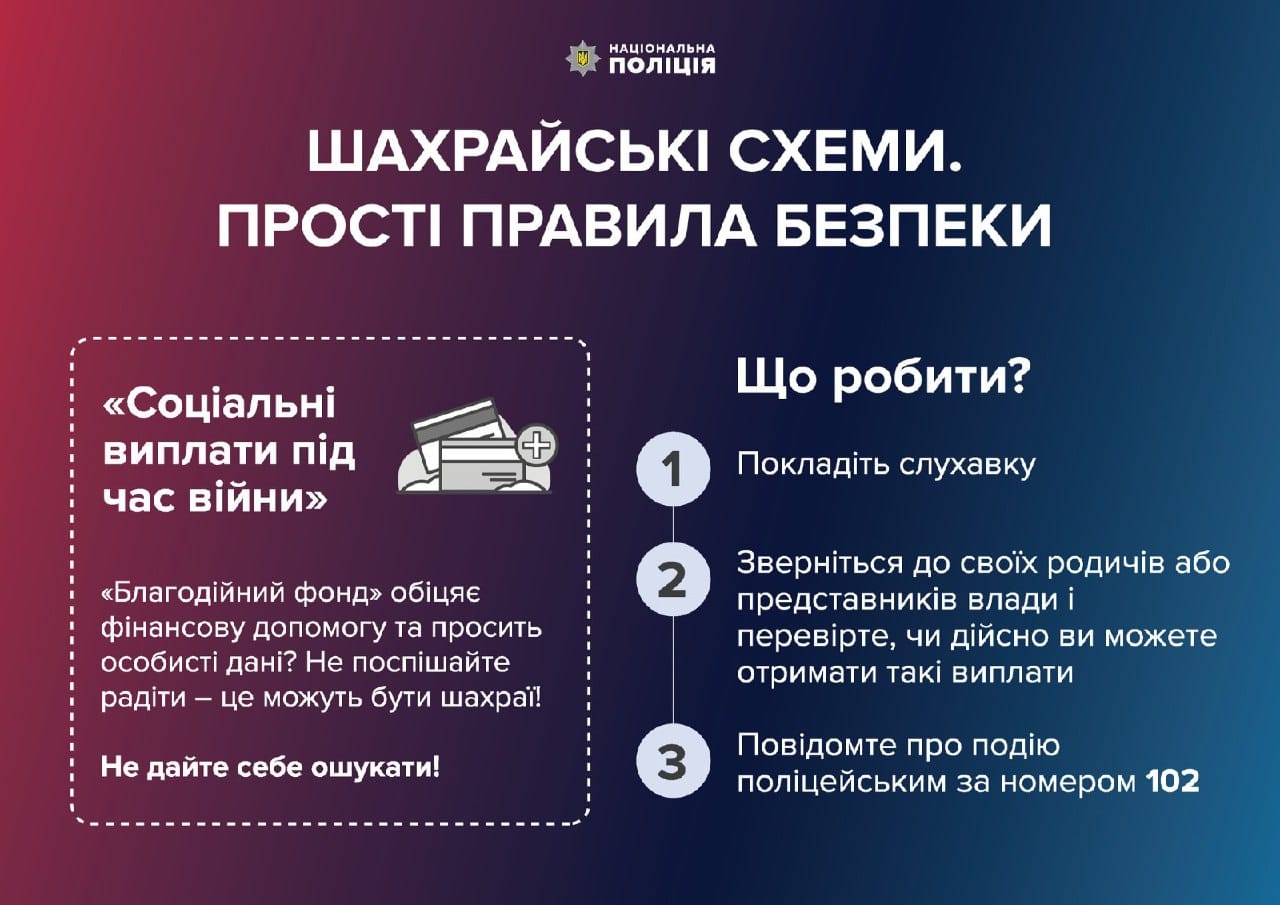 Щоб не втратити заощадження, отримуйте інформацію про грошові виплати лише з офіційних джерел, а не з месенджерів та мобільних додатків. Не переходьте за посиланнями та не вводьте реквізити платіжних карток на незнайомих чи підозрілих веб-сайтах, оскільки шахраї можуть отримати доступ не лише до банківського рахунку, а й до кредитного ліміту.