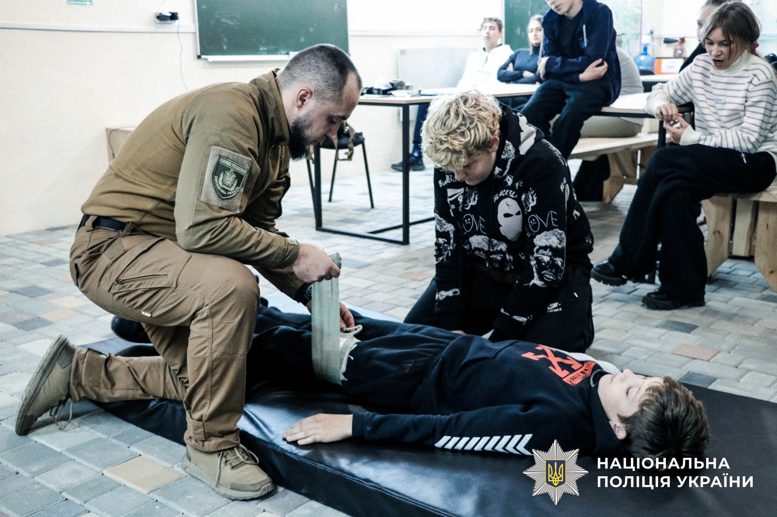 Поліцейські розповіли школярам про основні правила та принципи домедичної допомоги, а також роз’яснили алгоритм дій при наданні допомоги постраждалій людині впродовж перших хвилин після екстреної події. Тренери показали дітям, як правильно зупиняти кровотечу, накладати турнікети, пов'язки та бандажі, а також діяти до прибуття медиків.
